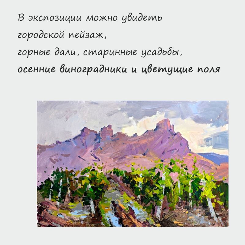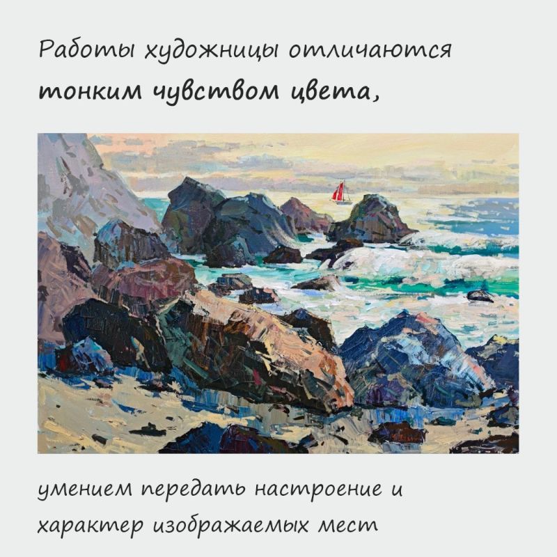 Живописные полотна погружают зрителя в мир красок и переносят то на каменистое побережье Гурзуфа, то к подножию крымских гор, то на старые улочки южнобережных городов. Каждая картина наполнена жизнью и любовью художницы к родному краю.