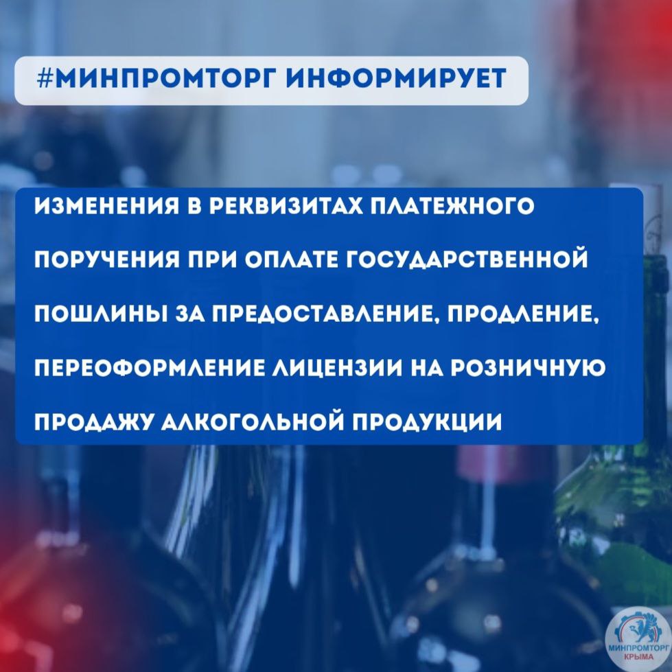 Минпромторг Крыма обращает внимание на заполнение платежного поручения при оплате государственной пошлины за предоставление, продление, переоформление лицензии на розничную продажу алкогольной продукции