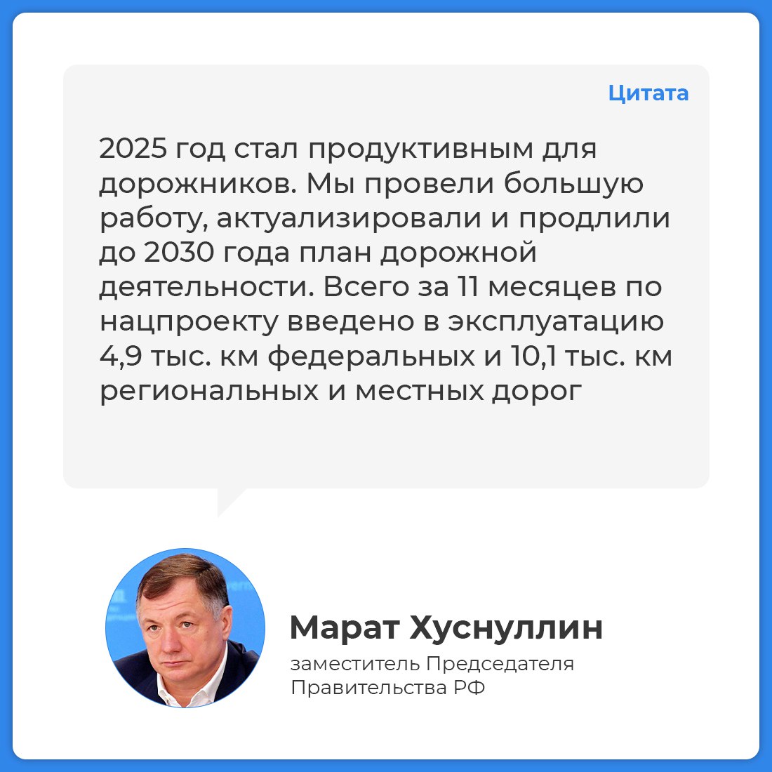 В рамках нацпроекта «Инфраструктура для жизни» с начала года введено в эксплуатацию почти 15 тысяч километров дорог — 4,9 тыс. км федеральных и более 10 тыс. км региональных и местных. Об этом сообщил заместитель председателя правительства Марат Хуснуллин.