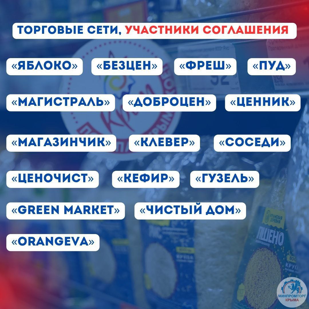 С участниками Соглашения, адресами магазинов и актуальными ценами Вы можете ознакомиться на сайте Минпромторга Крыма: https://mprom.rk.gov.ru/structure/bb569b0e-e56e-476d-862b-bdcc86ee1bf0.