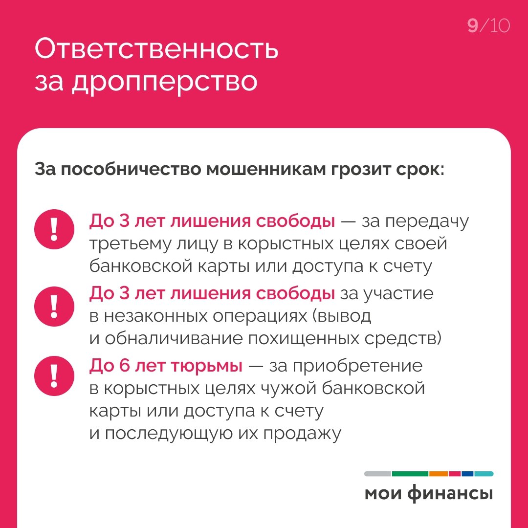 Портал "Мои финансы" подготовил полезные карточки, которые объясняют как не стать участником преступной схемы и избежать уголовной ответственности!