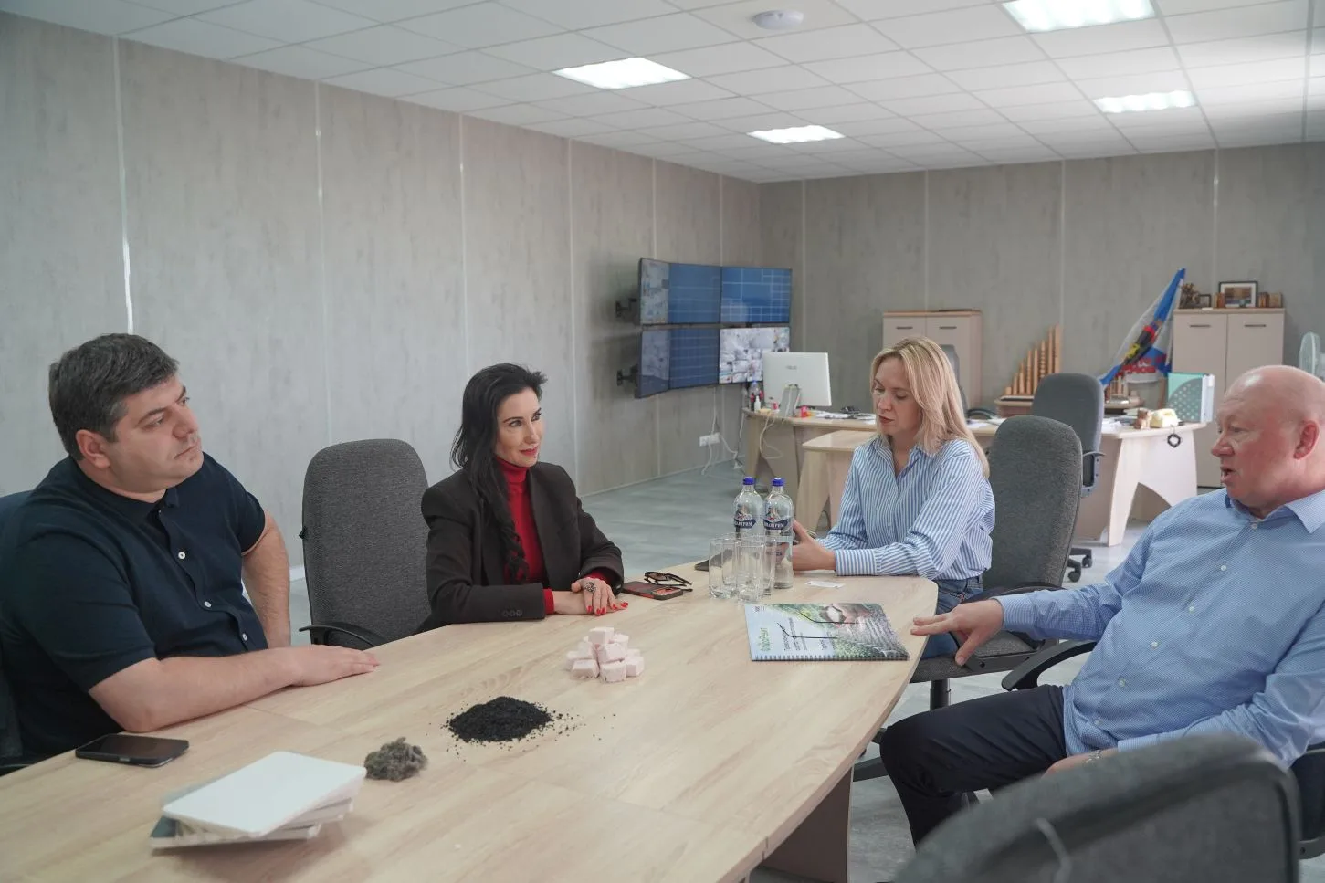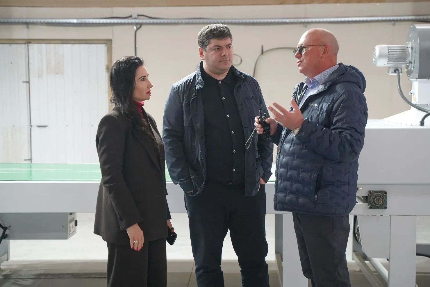 Посетили и предприятие, выпускающее декоративные стеновые и потолочные панели. Производство организовано по принципу полного цикла — от подбора сырья до упаковки готовой продукции, а мощности позволяют выпускать до 2500 квадратных метров продукции в сутки. Помимо основной деятельности, предприятие развивает новое для региона направление — производство субстрата для растений из переработанных автомобильных шин, перерабатывая до 1,5 тысяч единиц в день.