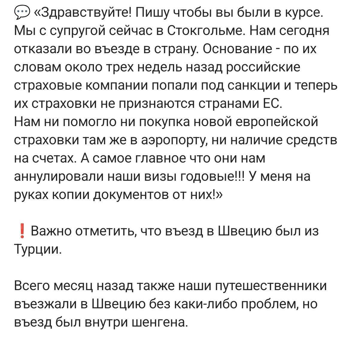 Сенсация! Сенсация! Швеция начала аннулировать визы россиянам, о чем россияне, успевшие попасть в Швецию, предупреждают остальных.