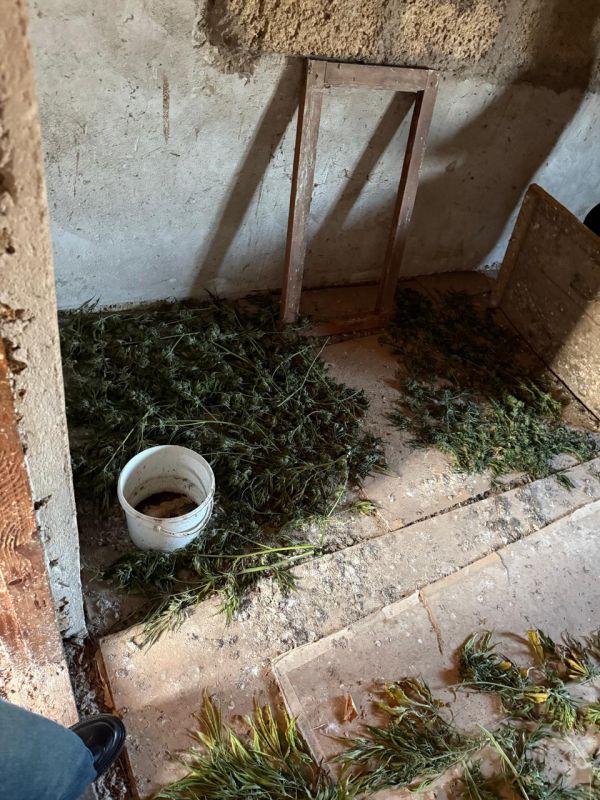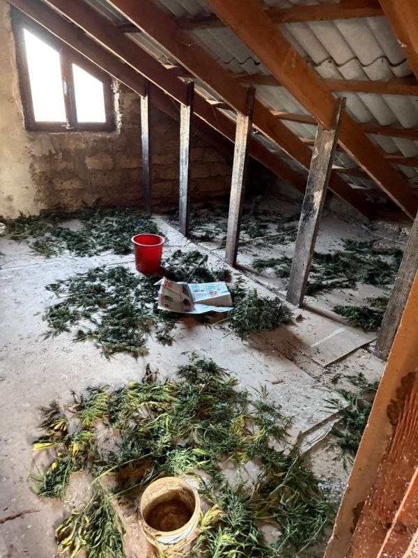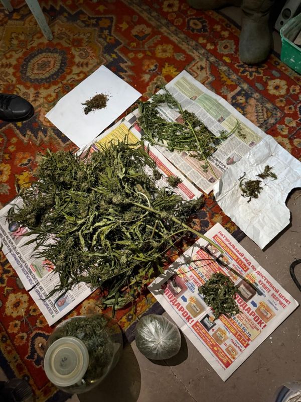 В результате осмотра были обнаружены высушенные части растений конопли. Некоторые из них находились в подвешенном состоянии под потолком, другие были разложены на полу. Кроме того, в помещении были найдены стеклянная емкость и полимерный пакет, содержащие сухое вещество, предположительно являющееся марихуаной.