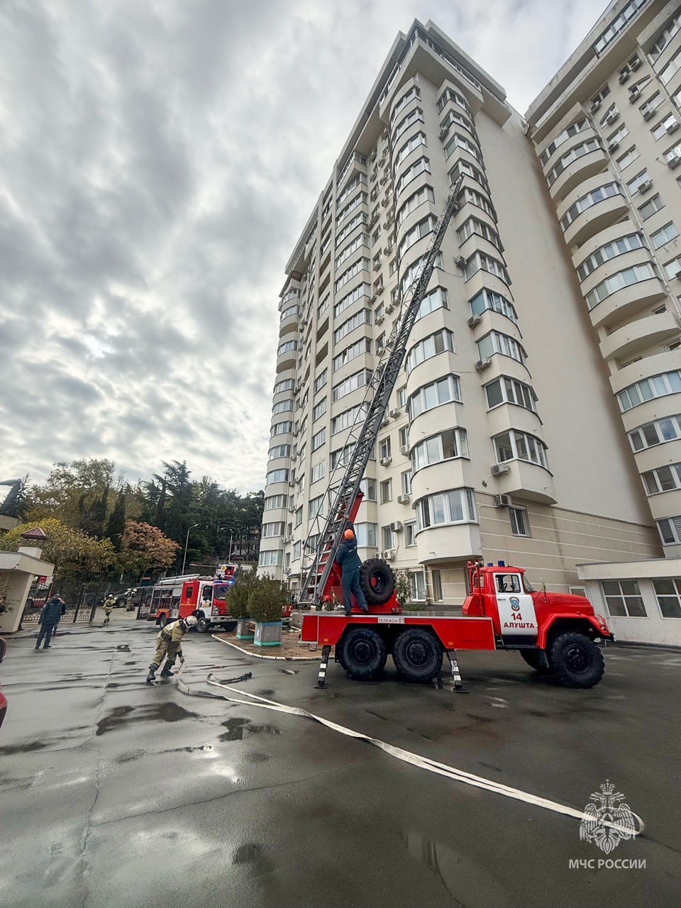 Алуштинские огнеборцы провели опытное пожарно-тактическое учение. Согласно легенде, возгорание произошло в одной из квартир шестнадцатиэтажного многоквартирного дома из-за нарушения правил пожарной безопасности при проведении огневых работ.