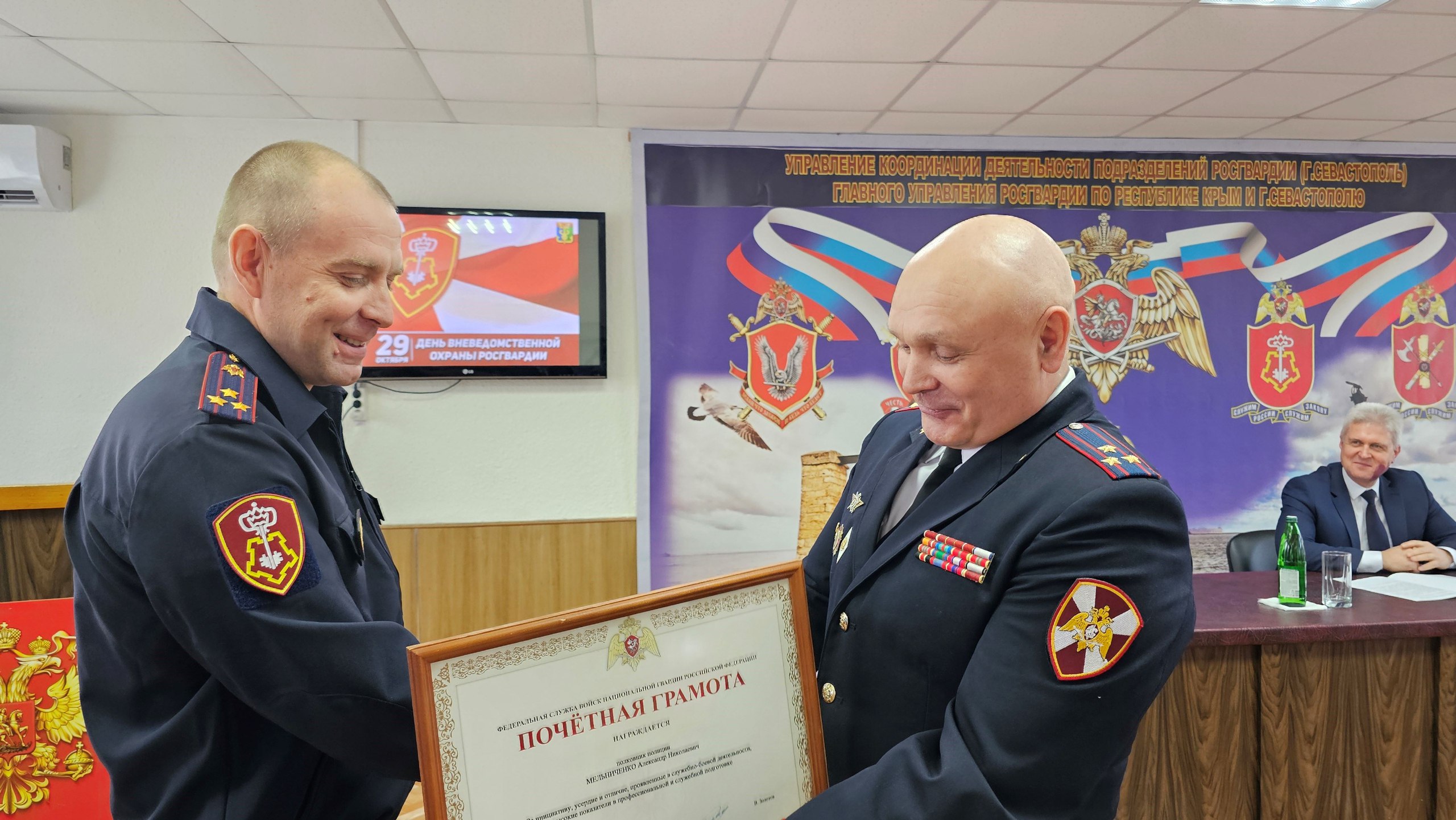 Торжественные мероприятия по случаю праздника прошли и в Севастополе. Офицеров вневедомственной охраны Росгвардии поздравил заместитель начальника Главного управления – начальник управления координации деятельности подразделений Росгвардии в городе Севастополе полковник полиции Владимир Соболев, отметив отличившихся сотрудников почетными грамотами и ценными подарками.