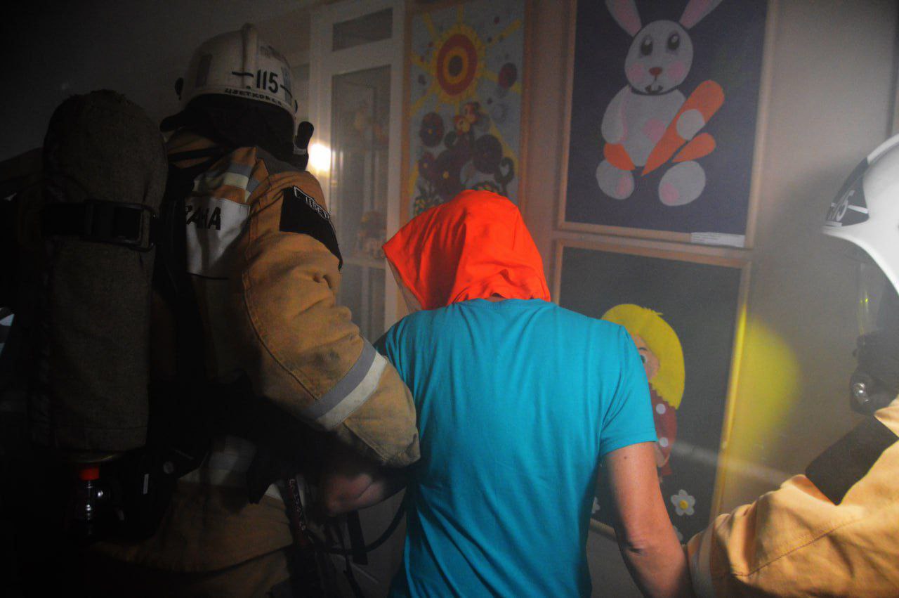 По замыслу тренировки, пожар произошел на 1-м этаже. Внутри здания сильное задымление. Администрация сообщила о происшествии в пожарную охрану и приступила к эвакуации обучающихся. Однако 2 человека не успели покинуть помещение.