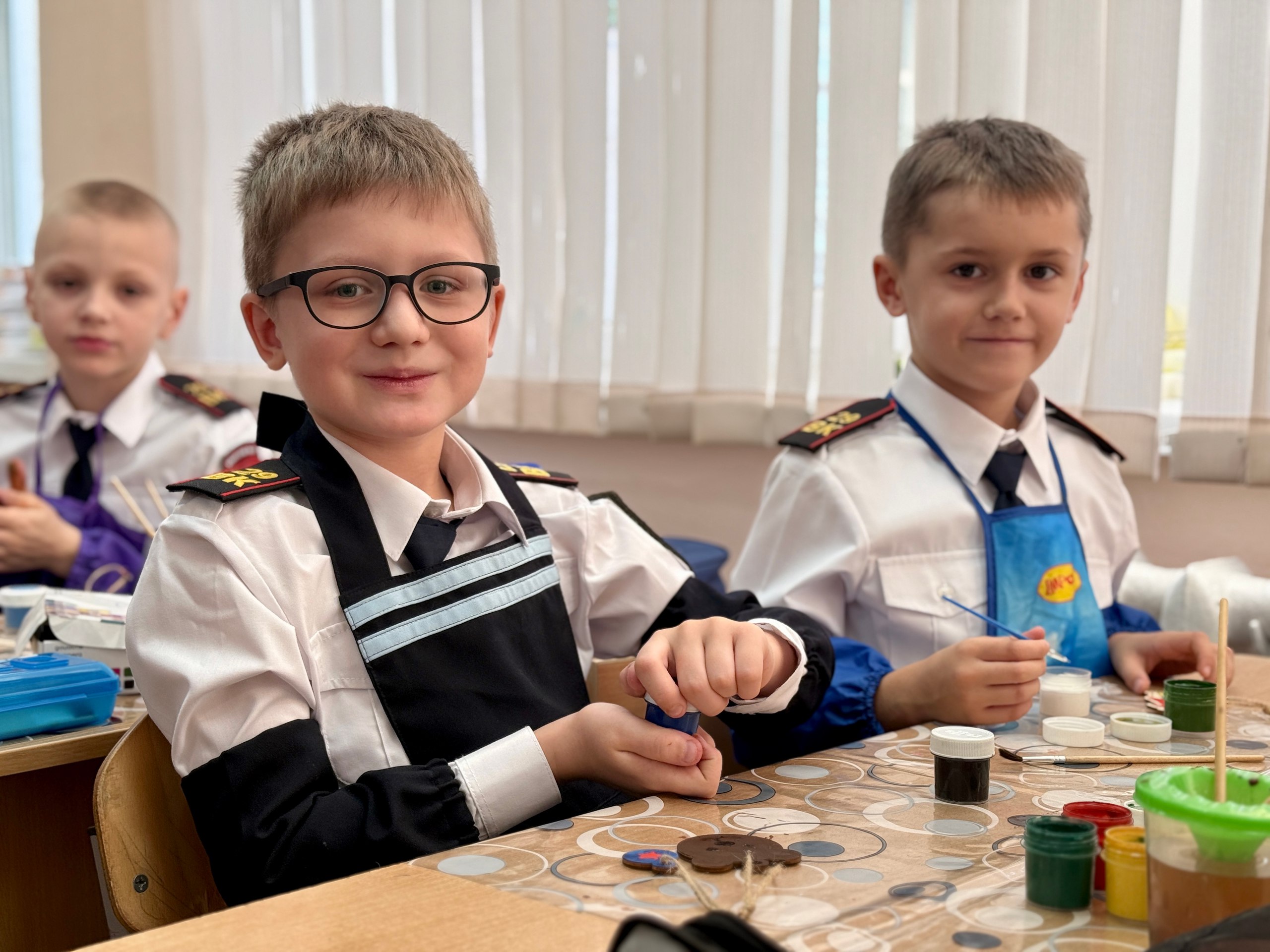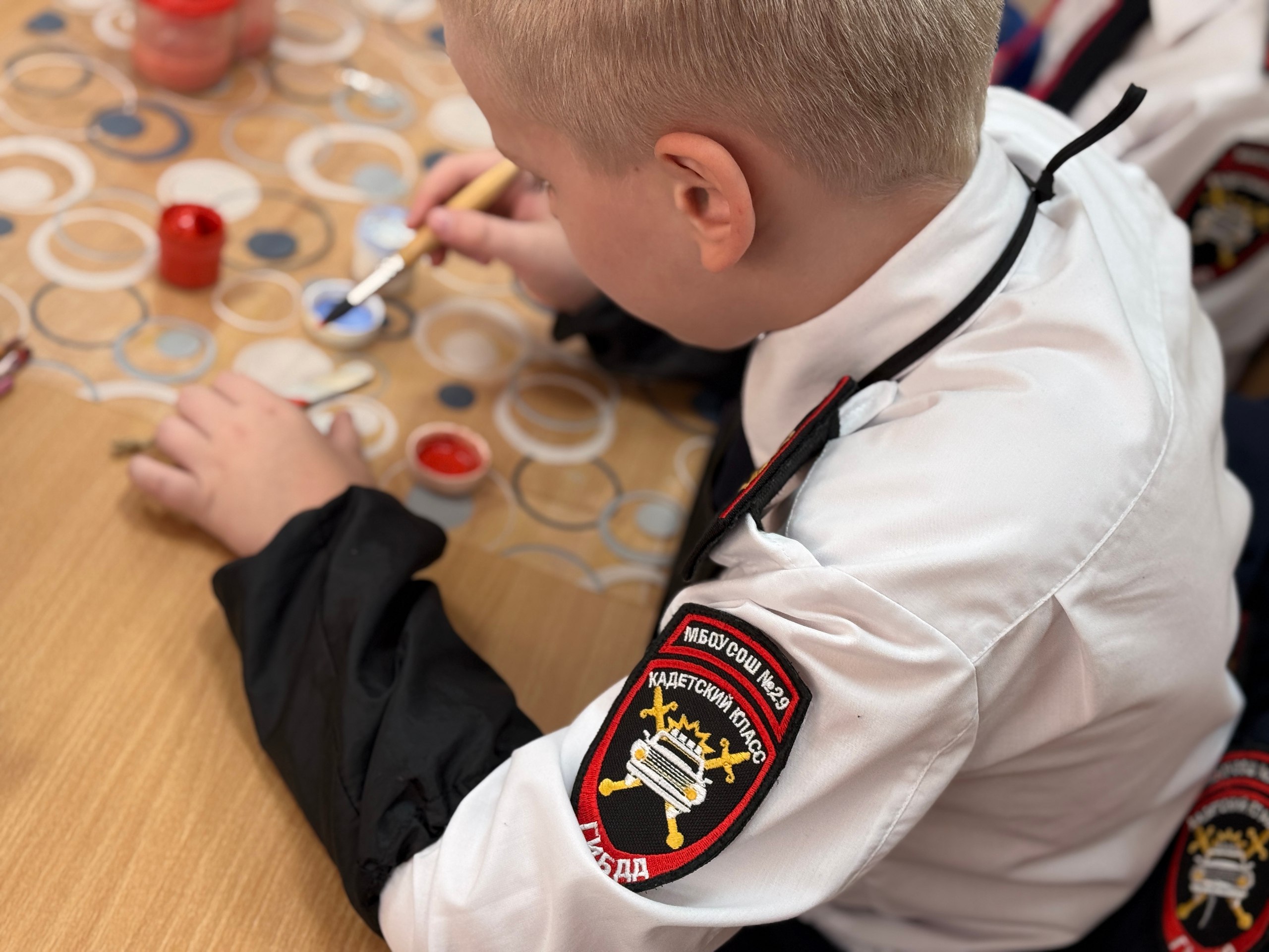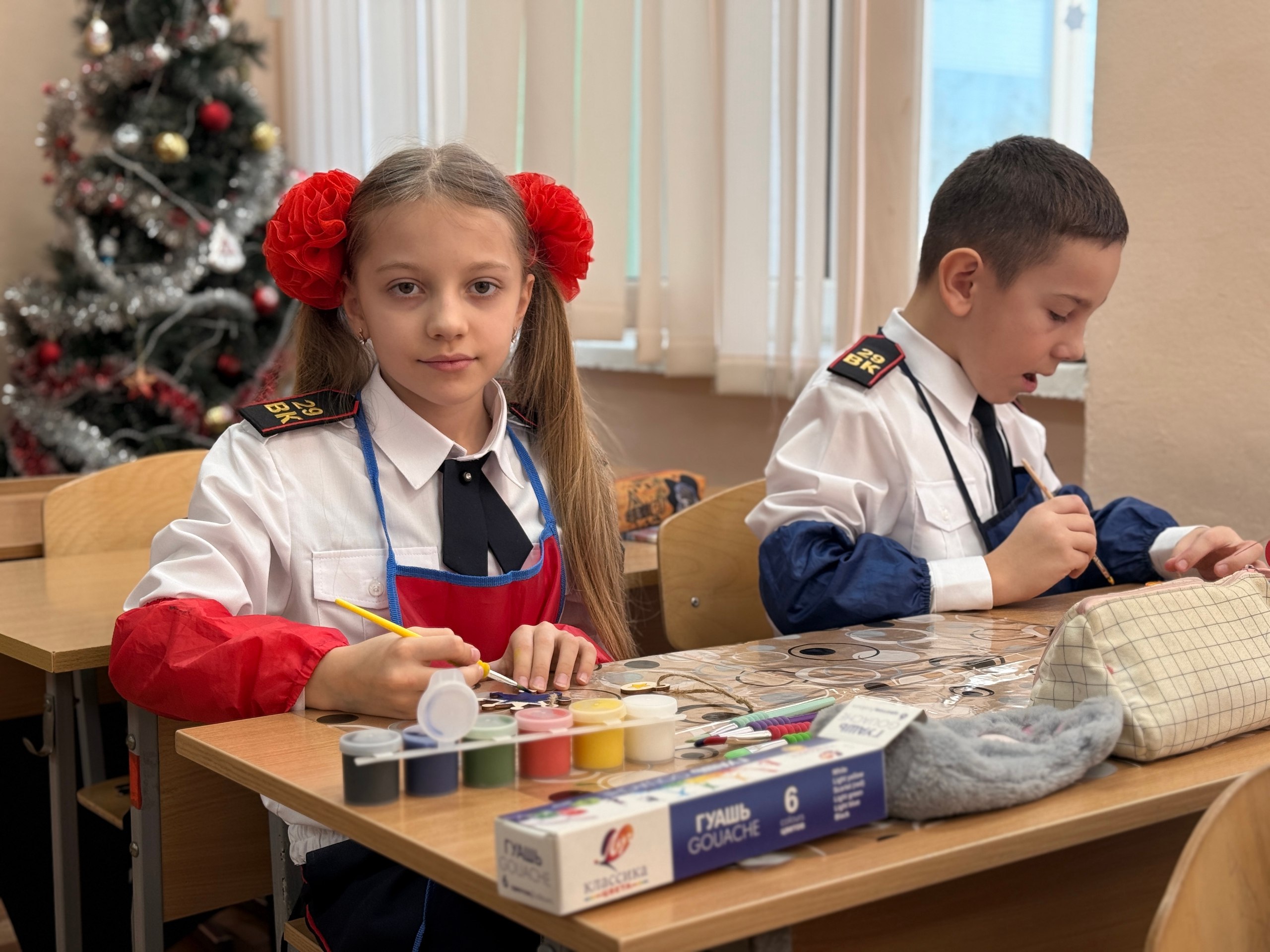 Ребята не только освежили свои знания правил дорожного движения в игровой форме, но и проявили творческие способности, раскрашивая деревянные игрушки. А затем, вместе с Дедом Морозом и сотрудником полиции, кадеты собственноручно созданными украшениями украсили праздничную ёлку.