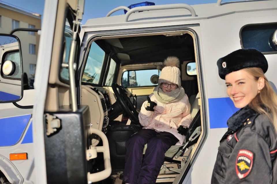 Для Кати был организован по-настоящему насыщенный день. Она прокатилась на раритетном служебном автомобиле, изучила различные виды транспорта и спецтехники, примерила VR-очки, осмотрела рабочие кабинеты госавтоинспекторов и получила памятные подарки.