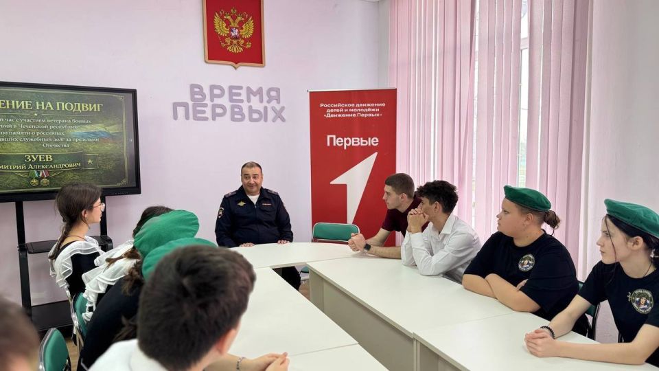 В МБОУ «Краснофлотская СШ» прошёл классный час «Равнение на подвиг», посвящённый Дню памяти россиян, исполнявших служебный долг за пределами Отечества. Гостем встречи стал Зуев Дмитрий Александрович — начальник отдела Госавтоинспекции ОМВД России по Советскому району, ветеран боевых действий в Чеченской Республике.