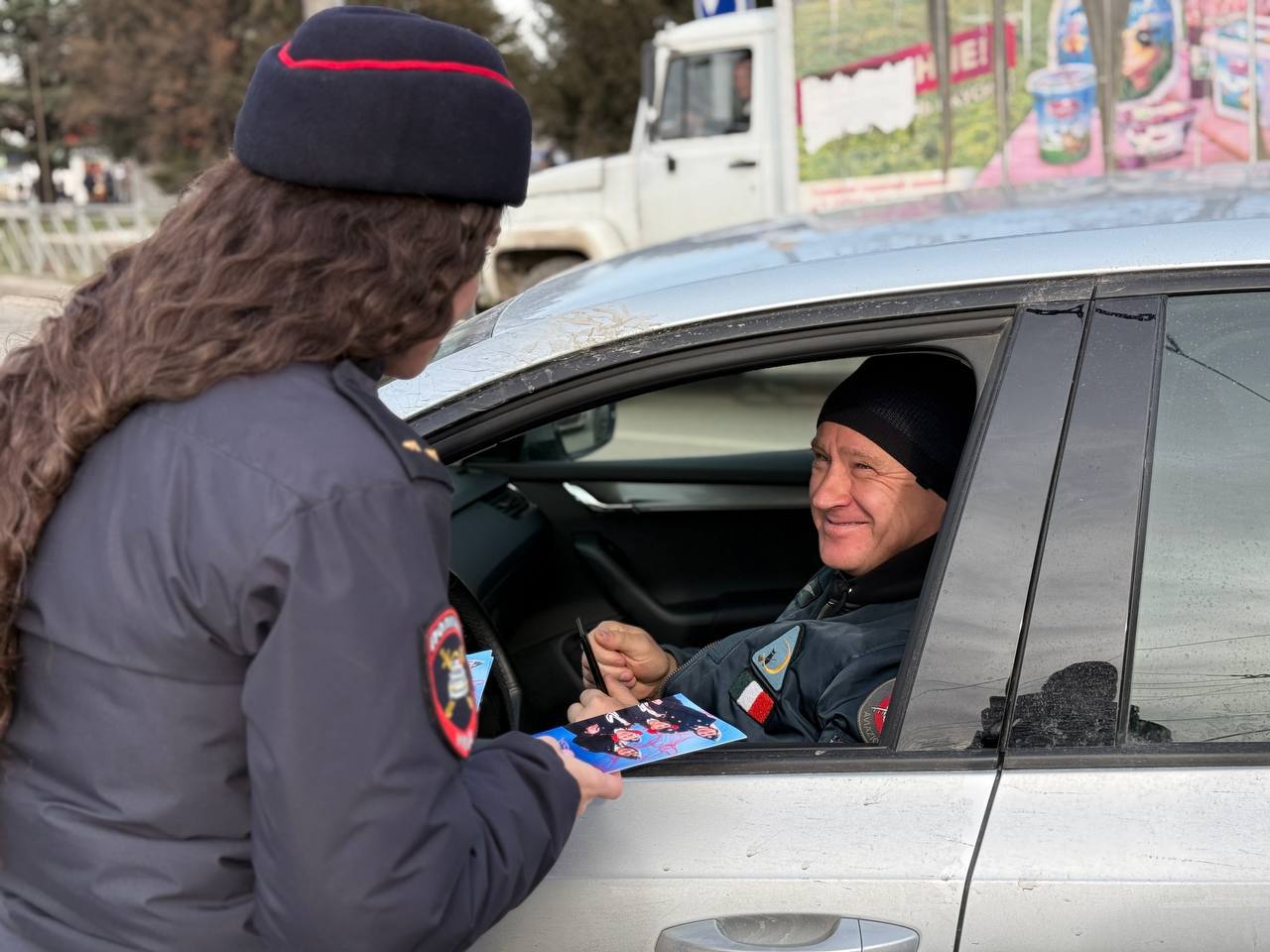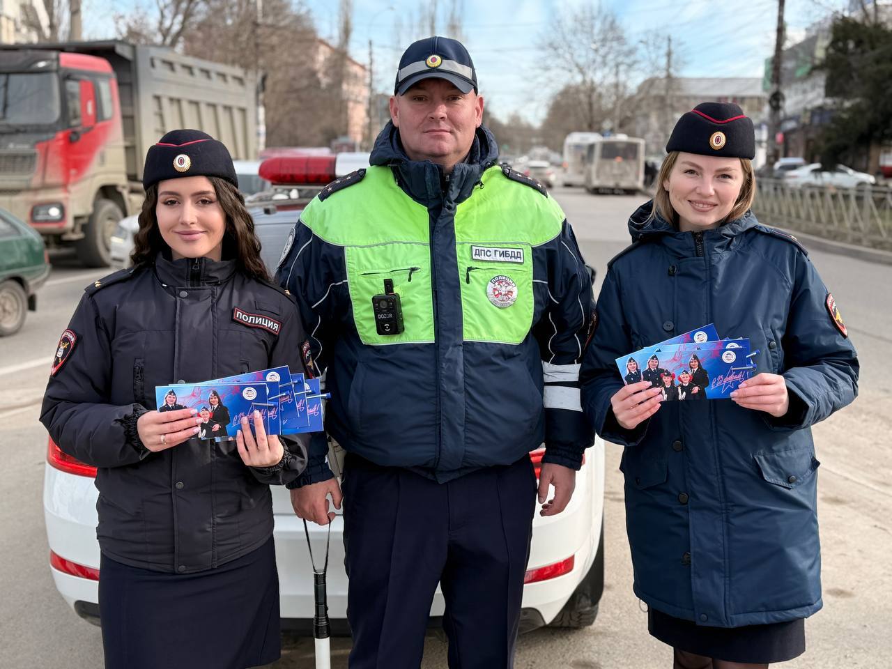 На дорогах инспекторы останавливали автомобили для стандартной проверки документов. Вместо привычной строгости водителей встречали улыбки и добрые слова со стороны сотрудниц Госавтоинспекции. Мужчин поздравляли с праздником, вручали небольшие подарки и говорили тёплые пожелания.