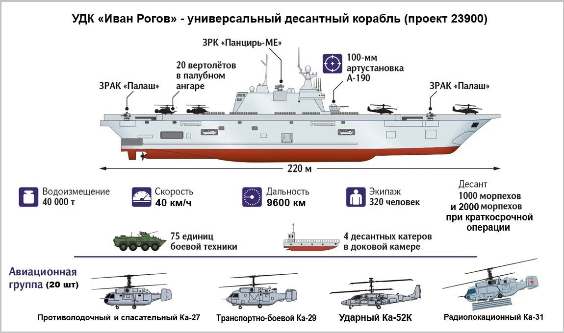 УДК, также называемые вертолётоносцами, станут новым типом корабля для русского флота. Их основным назначением является перевозка и высадка морской пехоты с необходимой ей техникой в виде боевых машин и катеров, а также обеспечение воздушной поддержки операции с помощью вертолётов и беспилотников.