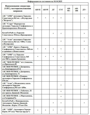 Уважаемые жители и гости Джанкойского района!Делюсь с вами актуальной информацией о наличии топлива на АЗС Джанкойского района по состоянию на 18.10.2025 на 09:00