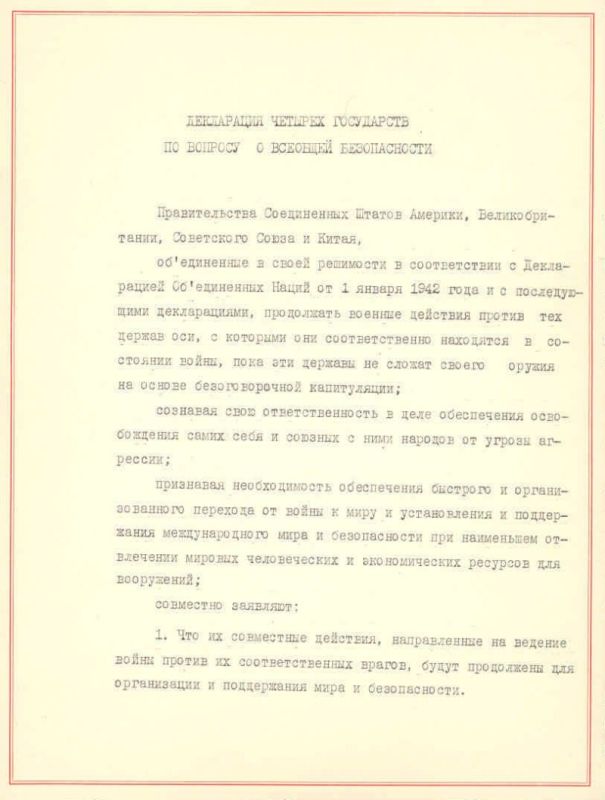 30 октября подписана «Декларация четырёх государств» вопросу о всеобщей безопасности». В пункте 4 этого Документа была зафиксирована необходимость создания «международной организации для поддержания мира и безопасности». Таким образом, начал формироваться международно-правовой базис для создания после войны Организации Объединённых Наций.