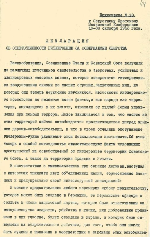 Не менее важным достижением советской дипломатии стало подписание «на полях» Конференции «Декларации об ответственности гитлеровцев за совершаемые зверства», которая заложила основы для будущего процесса над нацистскими военными преступниками — Нюрнбергского трибунала.