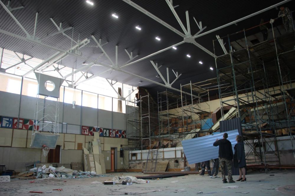 Строители заканчивают ремонт холла, продолжают работы по ремонту потолка в большом спортивном зале, после чего приступят к капремонту пола. Завершающим этапом станет обновление фасада.