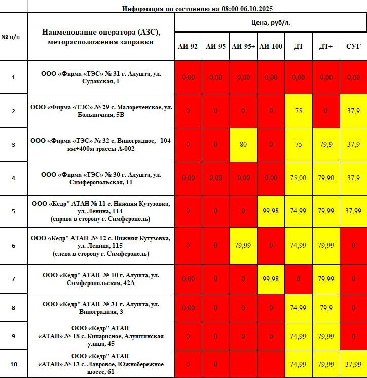 Уважаемые алуштинцы! Важная информация о наличии топлива в нашем муниципалитете по состоянию на 08:00 06.10.2025.