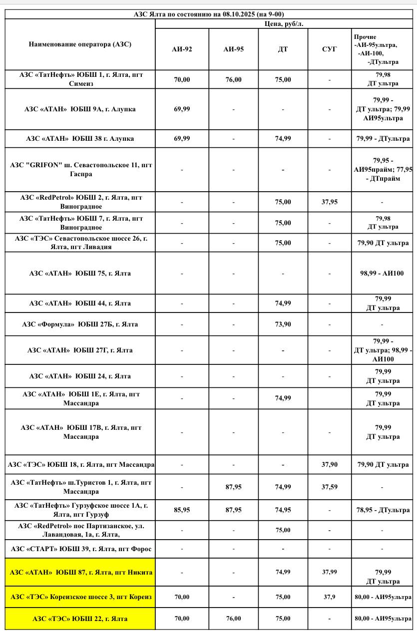 Актуальные данные о наличии топлива на АЗС Ялтинского региона на 09:00, 8 октября