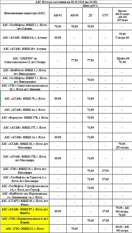 Уважаемые алуштинцы! Важная информация о наличии топлива в нашем муниципалитете по состоянию на 08:00 08.10.2025.#Алушта #ГалинаОгнёва #АдминистрацияАлушты