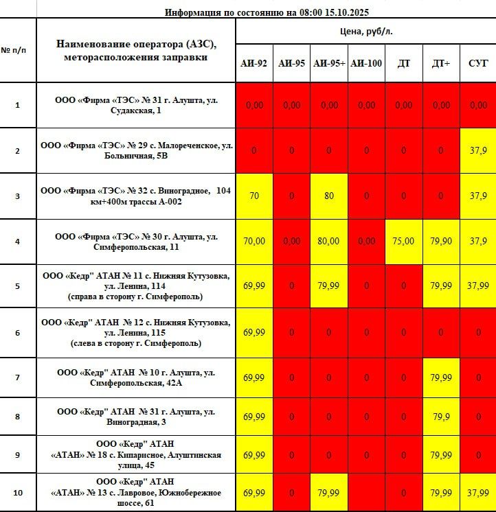 Уважаемые алуштинцы! Важная информация о наличии топлива в нашем муниципалитете по состоянию на 08:00 15.10.2025.