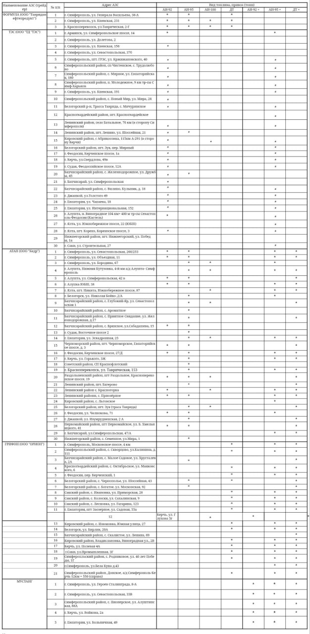 Перечень адресов АЗС, где имеется топливо в свободной продаже.