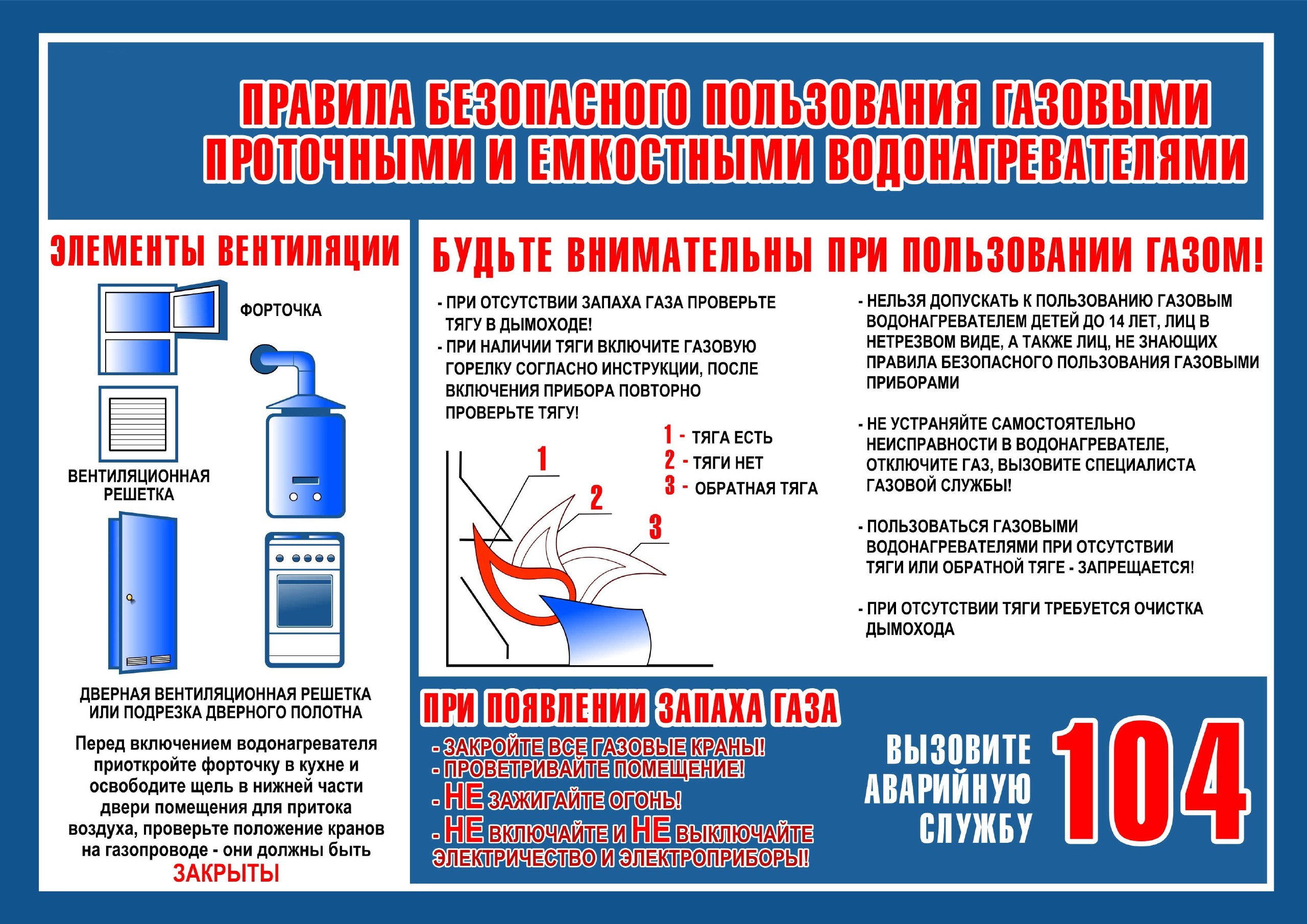 Запрещается заклеивать форточки, так как для полного сгорания газа необходим постоянный приток воздуха и наличие тяги в дымоходах и вентиляционных каналах;