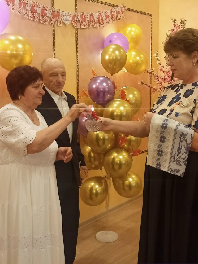 По традиции юбилярам был показан видеоподарок. Супруги встали на рушник и зажгли огонь семейного очага.