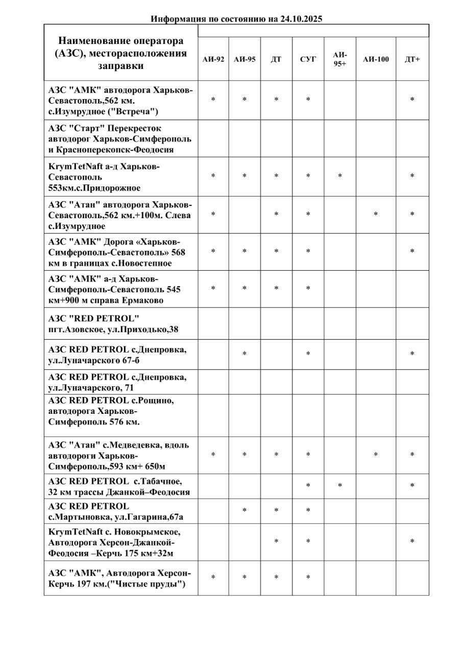 Делюсь с вами актуальной информацией о наличии топлива на АЗС Джанкойского района по состоянию на 24.10.2025 на 09:00