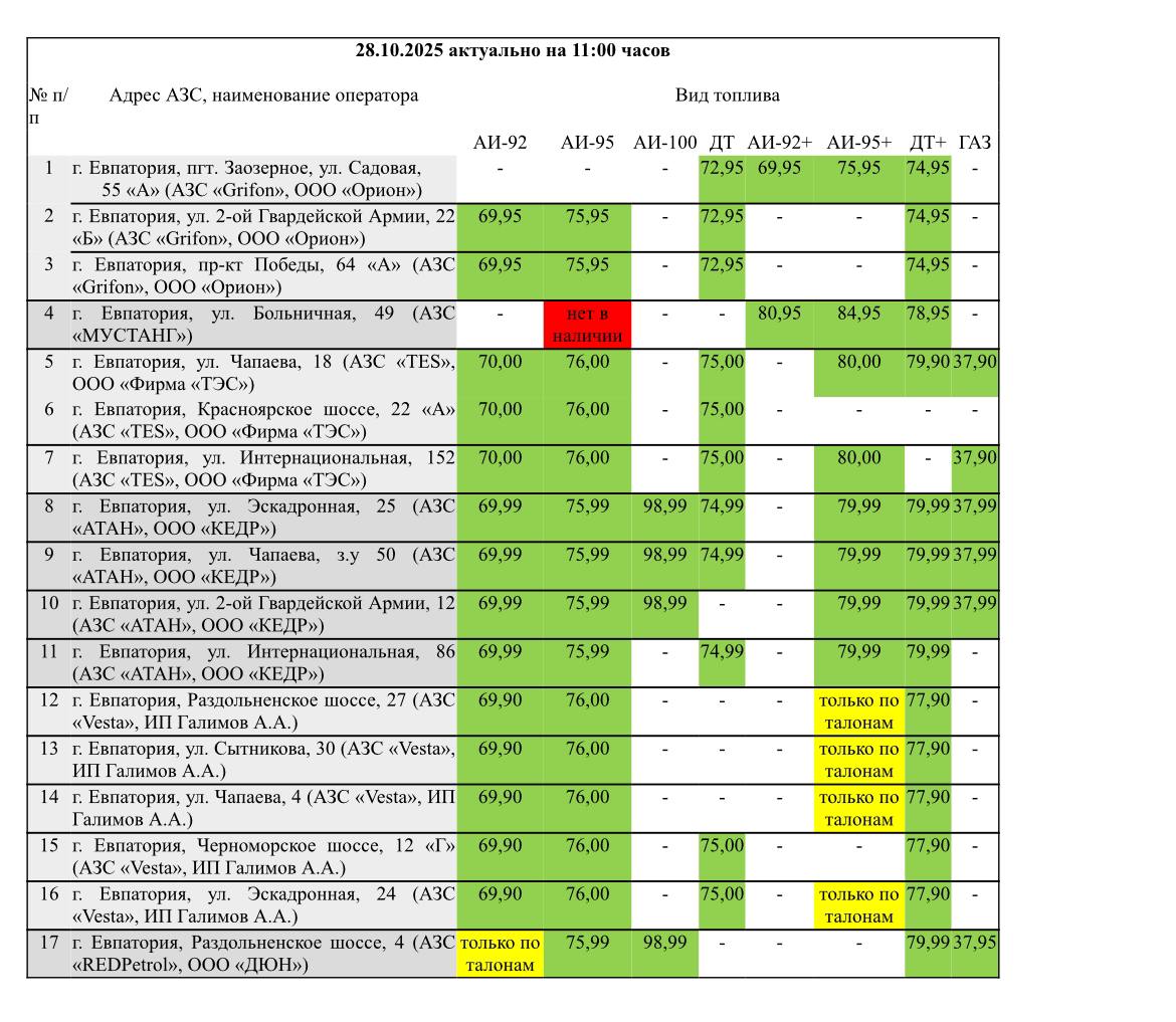 Публикуем данные о наличии топлива на АЗС Евпатории.
