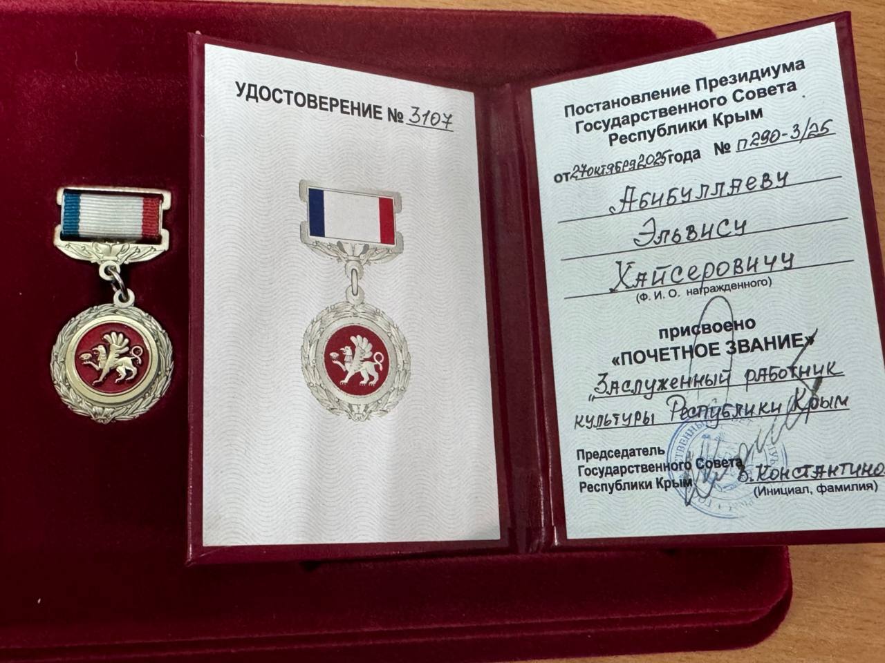 В преддверии Дня народного единства, в Государственном Совете Респубоики Крым прошло торжественное мероприятие, где были отмечены выдающиеся деятели культуры, науки и спорта полуострова, военнослужащие и защитники Отечества. Среди них - Эльвис Хайсерович Абибуллаев, чья виртуозная игра на аккордеоне и неустанная наставническая деятельность вдохновляют многих.