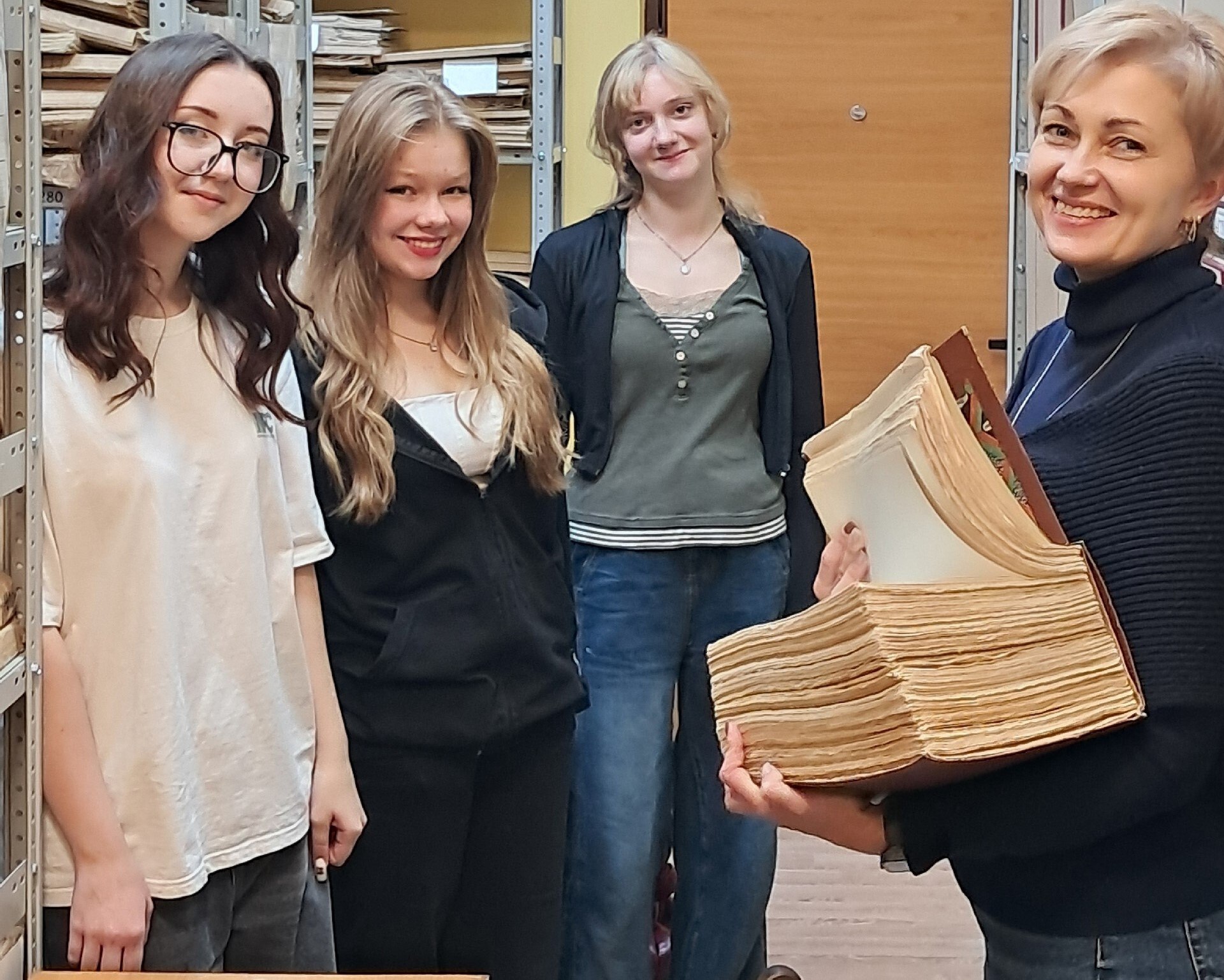 Сотрудниками отдела была проведена экскурсия по архивохранилищам, где учащиеся ознакомились с особенностями и условиями хранения документов, необходимостью поддержания температурно-влажностного и санитарно-гигиенического режимов. Особое впечатление на школьников произвело архивное дело, находящееся на хранении в отделе, вес которого составляет 8 кг.