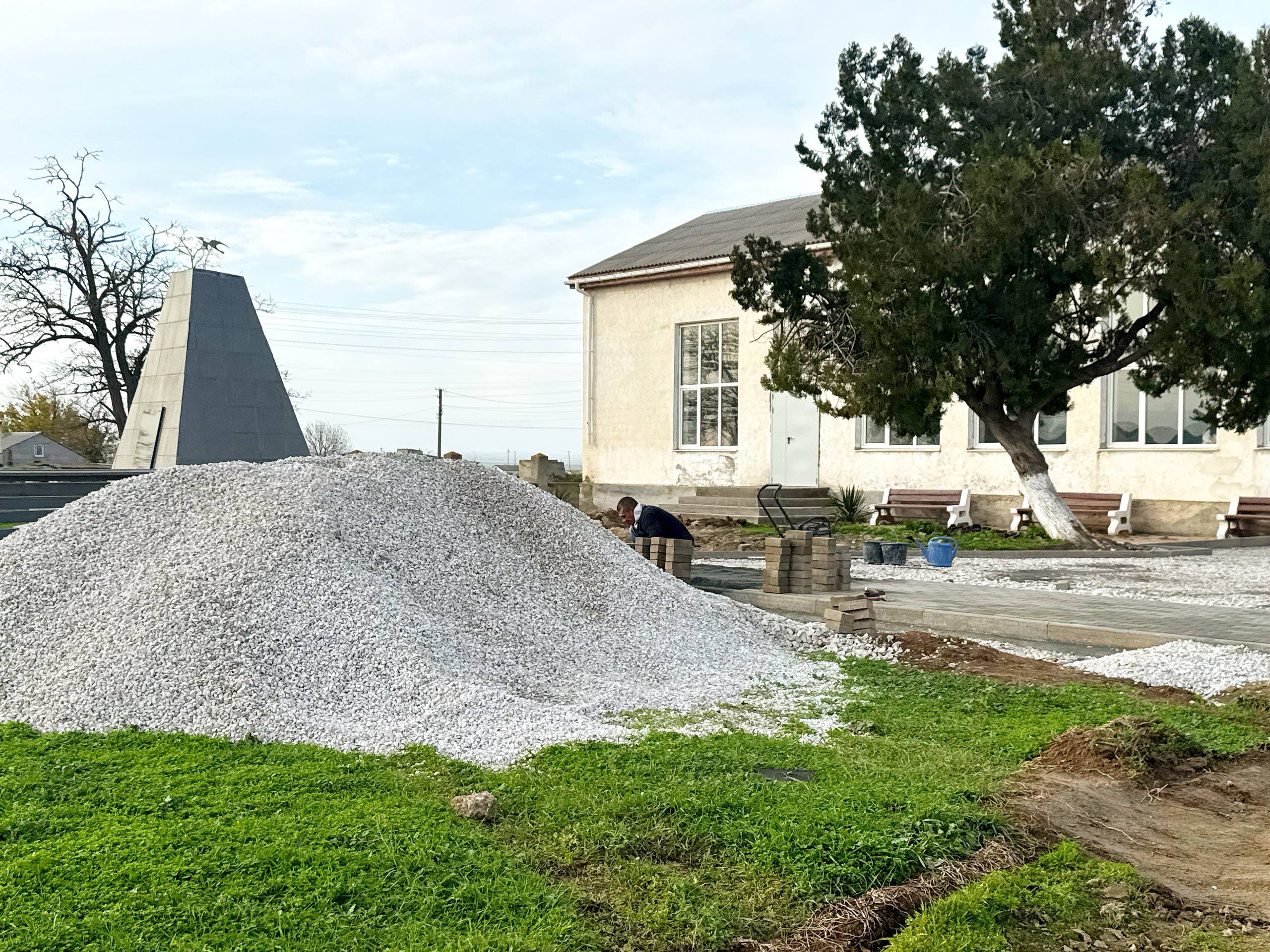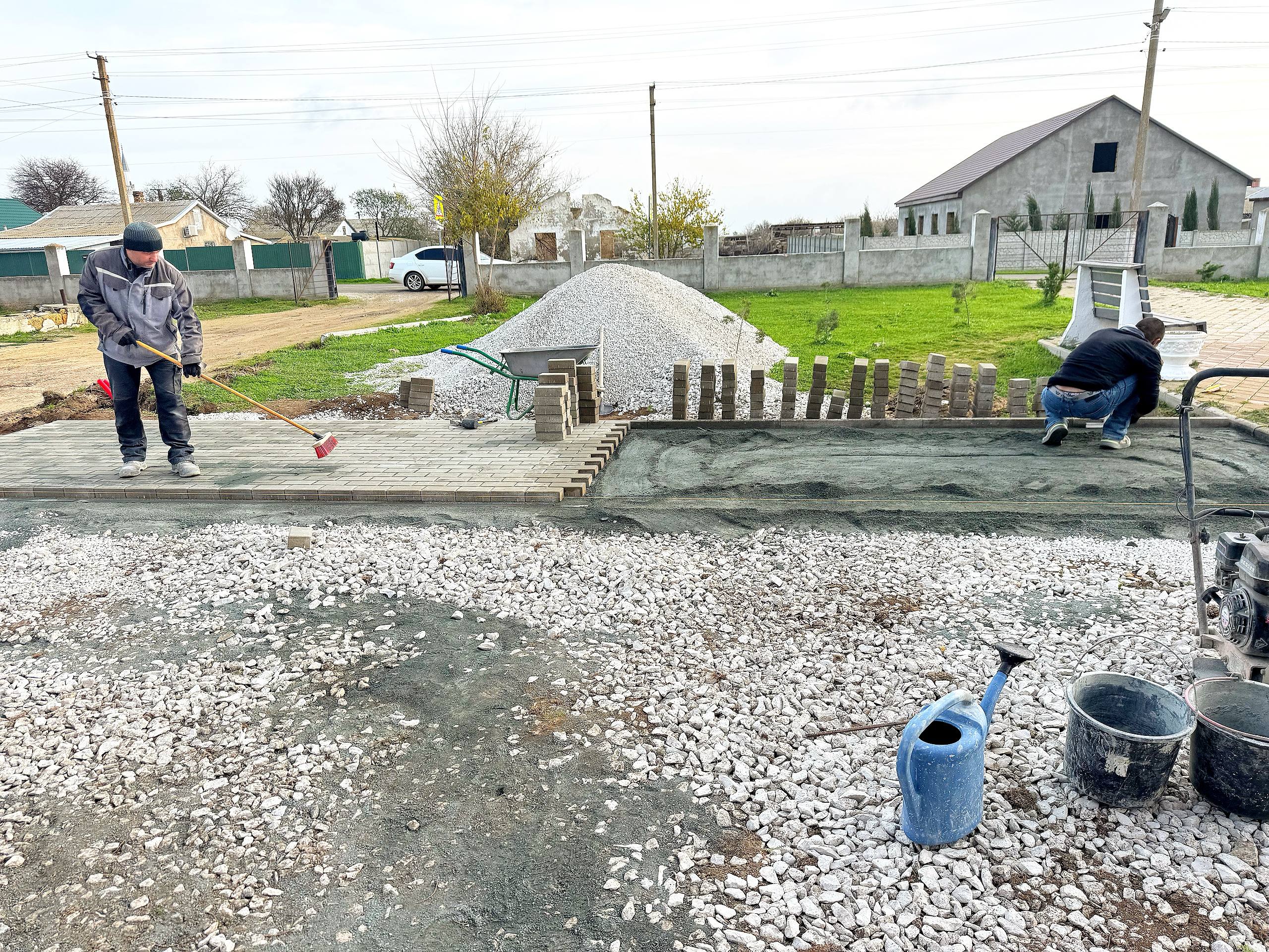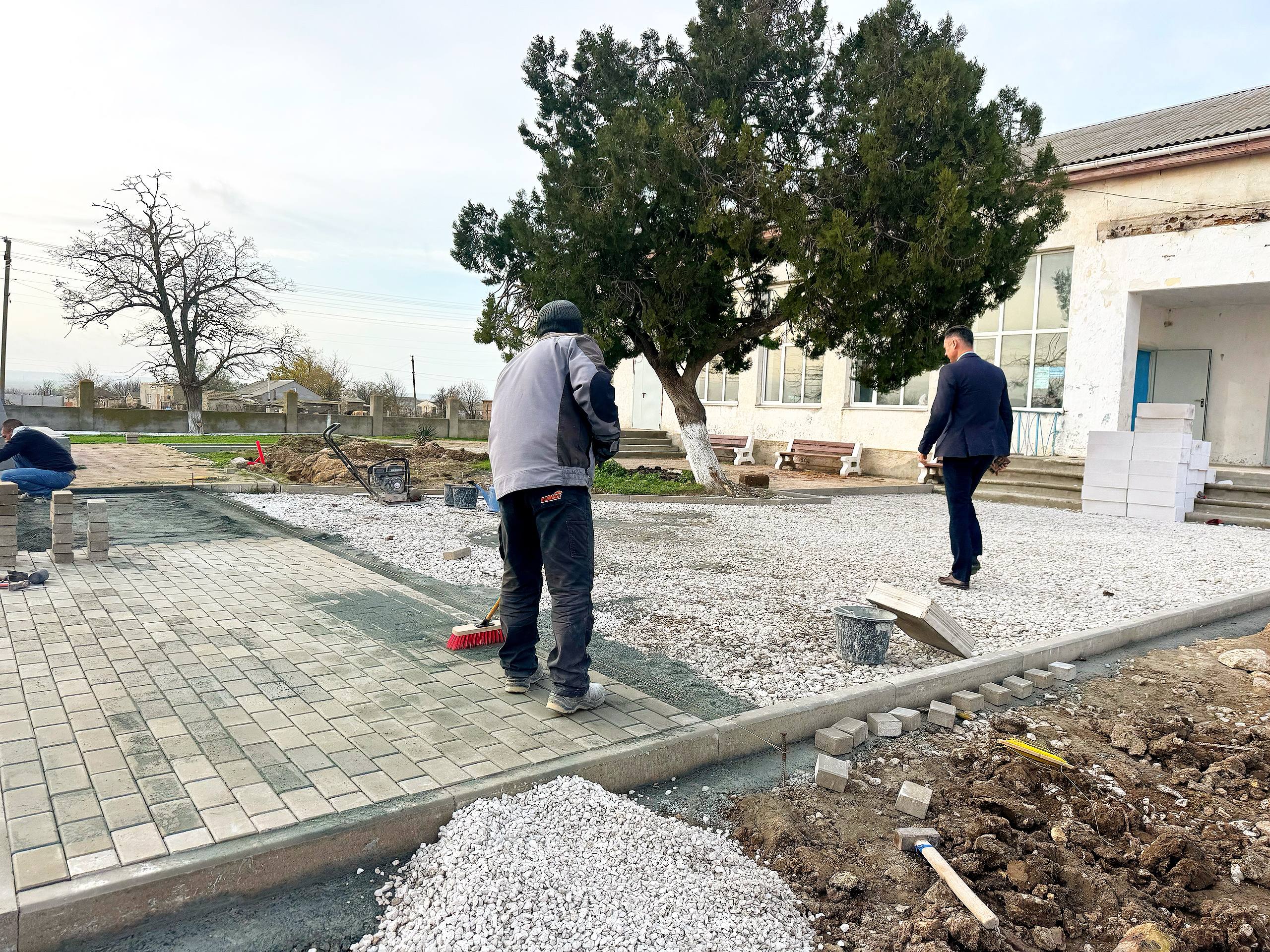 В Водопойном идут работы по благоустройству общественной территории возле сельского клуба. Сейчас строители занимаются мощением тротуарной плитки и установкой уличного освещения.