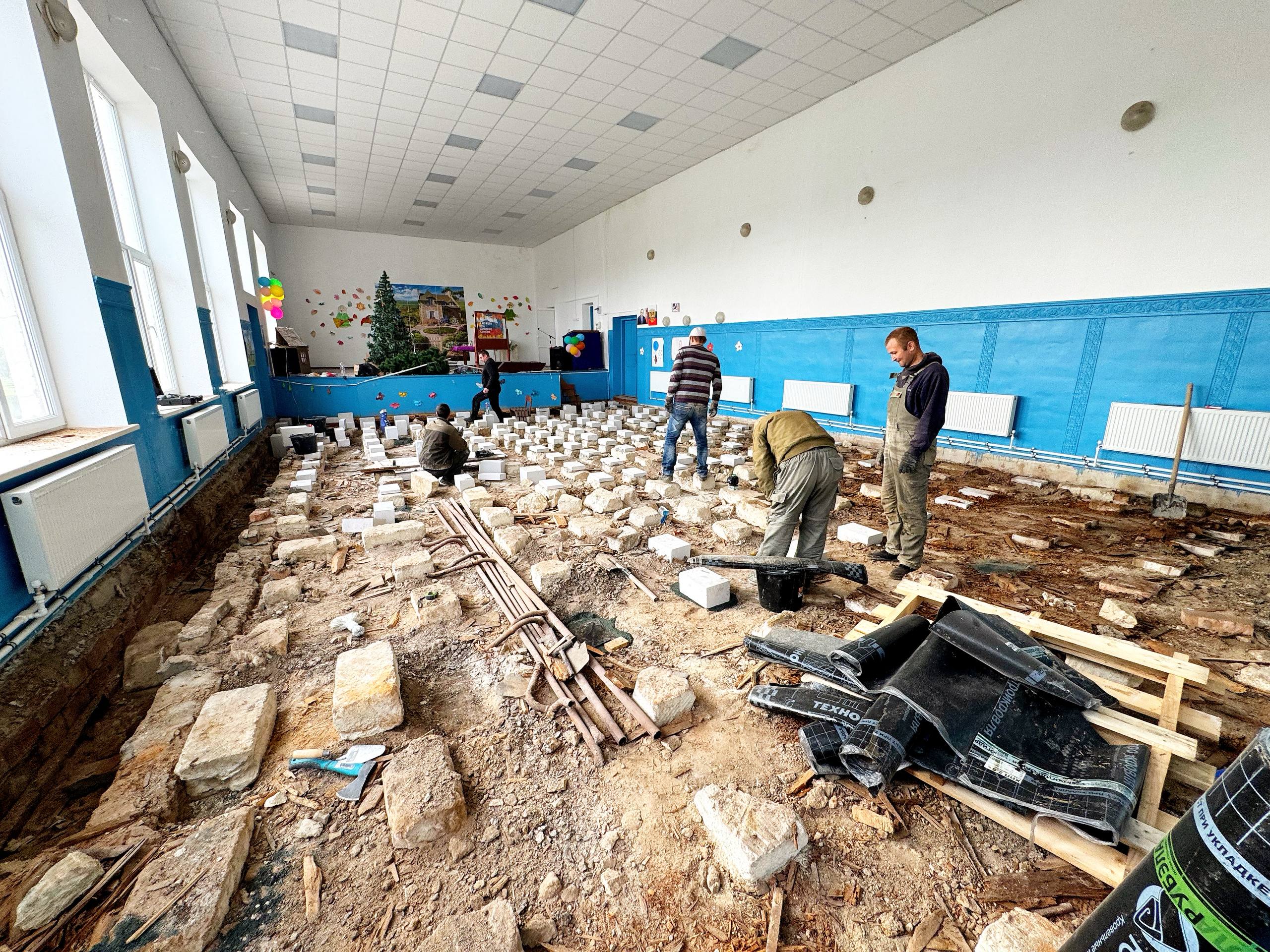 Еще одна бригада строителей ведет работу по обновлению зала Водопойненского сельского клуба. Завершены работы по замене потолка и демонтажу старых полов. Идет подготовка к обустройству нового напольного покрытия.