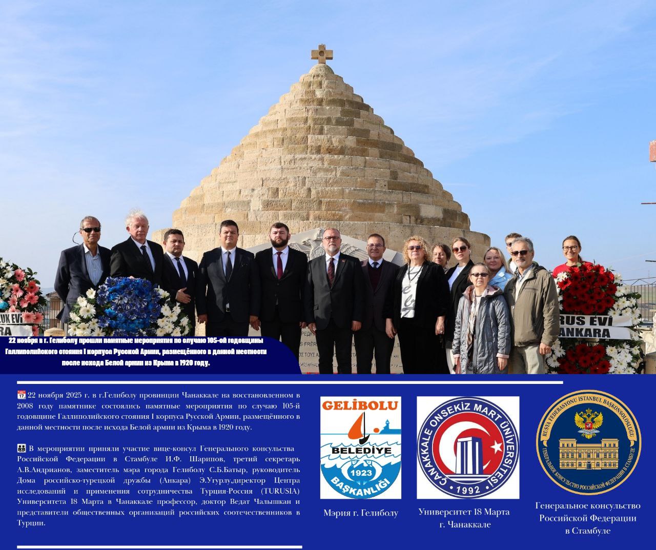 22 ноября 2025 года в г.Гелиболу провинции Чанаккале у восстановленном в 2008 году памятнике состоялись памятные мероприятия по случаю 105-й годовщины Галлиполийского стояния I корпуса Русской Армии, размещённого в данной местности после исхода Белой армии из Крыма в 1920 году.