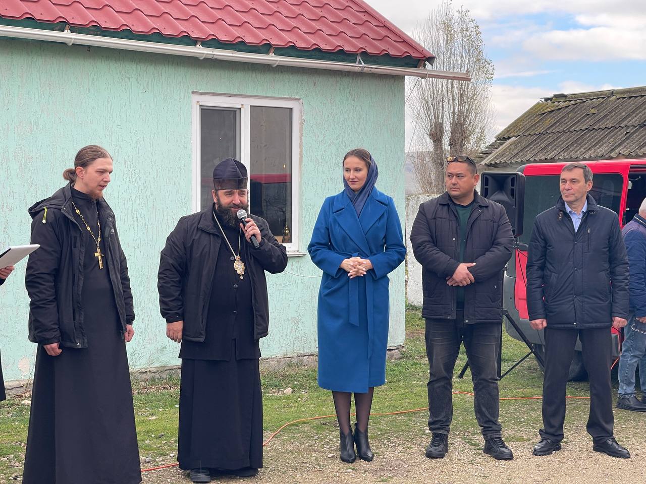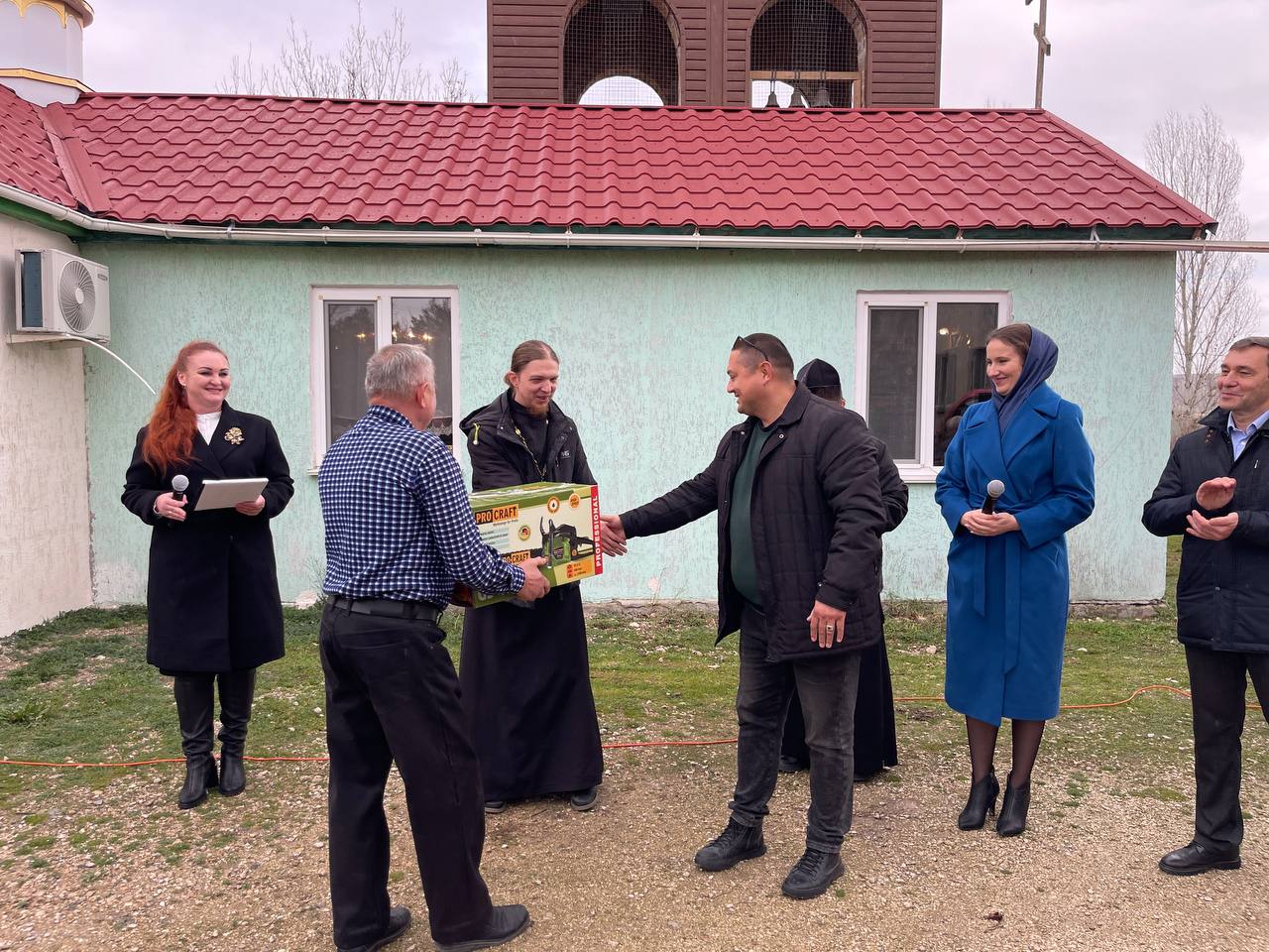 Особая благодарность приехавшему на молебен депутату Государственного Совета Крыма, заместителю генерального директора сети заправок «АТАН» Алексею Тихомирову и депутату Государственной Думы РФ Юрию Нестеренко за помощь в приобретении материалов и оплату работы строительной бригады, которая профессионально выполнила работы по ремонту фасада колокольни.