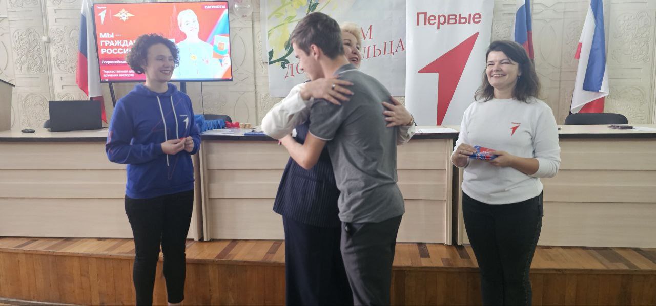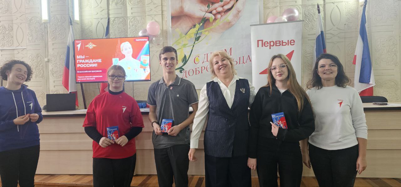 Наши юные граждане, которым исполнилось 14 лет приняли участие во Всероссийской программе «Мы граждане – России» и получили из рук заместителя главы администрации Сакского района Дорошенко Светлана Викторовна и председателя Совета местного отделения Чернышовой Юлии Вячеславовны обложки на паспорта и значки Движения Первых.