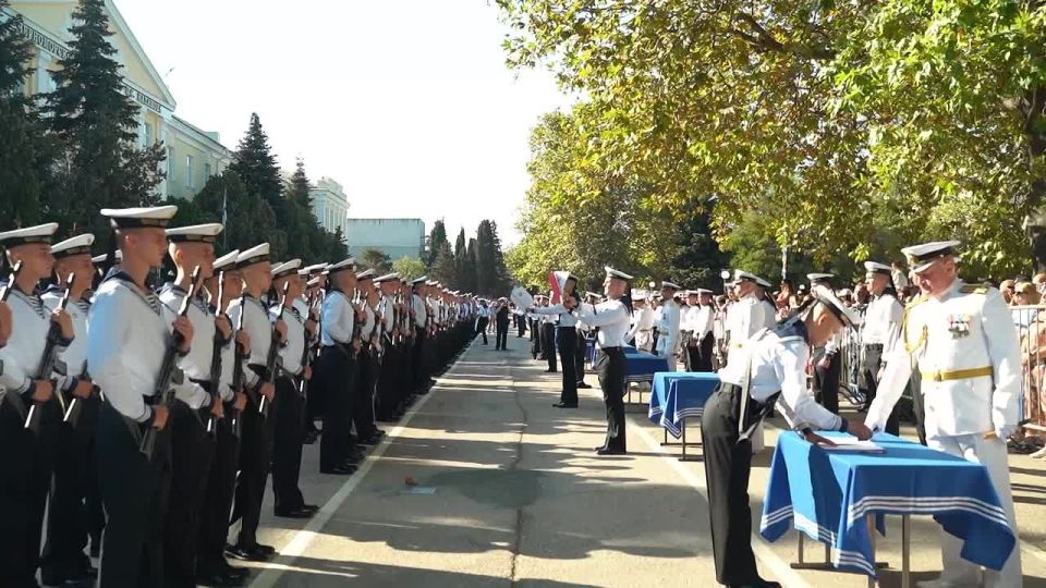 На флаг равняются курсанты военно-морских училищ и воспитанники морской флотилии в Севастополе.