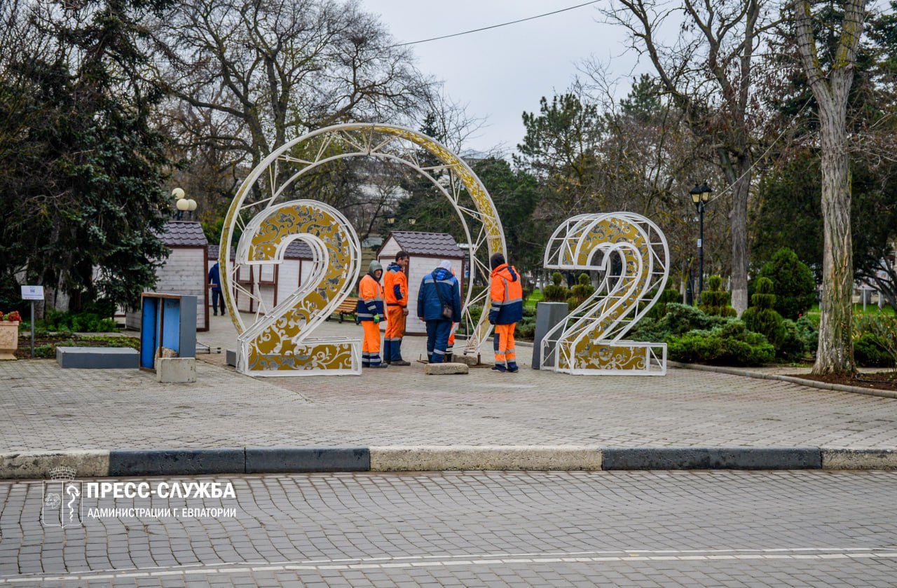 ФОТОФАКТ. Сотрудники МБУ «Порядок» устанавливают на улице Дувановской светящиеся инсталляции в виде цифр наступающего года