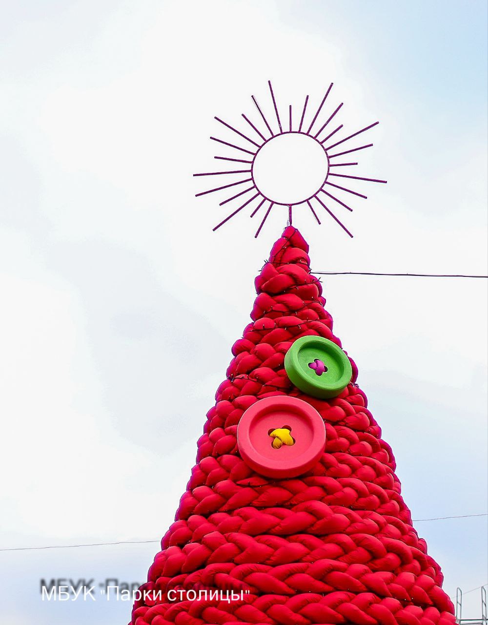 Необычный арт-объект создали крымские мастера. Ярко-красная ёлка изготовлена из сплетённых в косы поролоновых нитей и украшена разноцветными пуговицами.