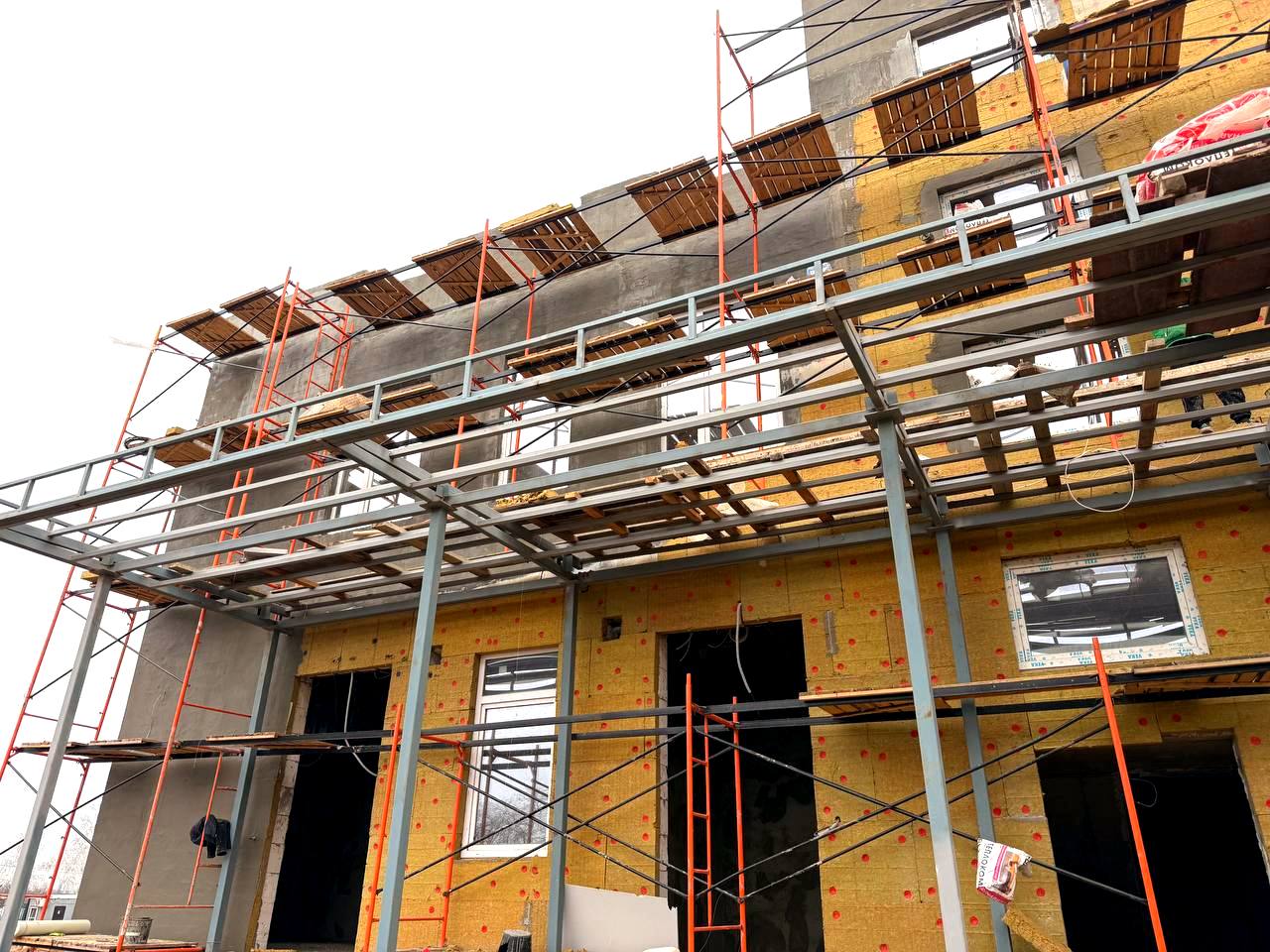 Сейчас на строительной площадке задействовано 23 человека и 2 единицы техники. Готовы фундаменты и каркас, заполнены газоблоком наружные и внутренние стены, завершено остекленение здания. Продолжается устройство стяжки пола, облицовка стен кафелем, монтаж утеплителя полов и штукатурка потолков. Ведутся фасадные работы.