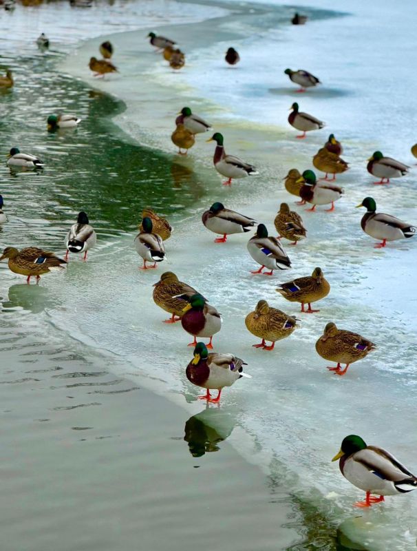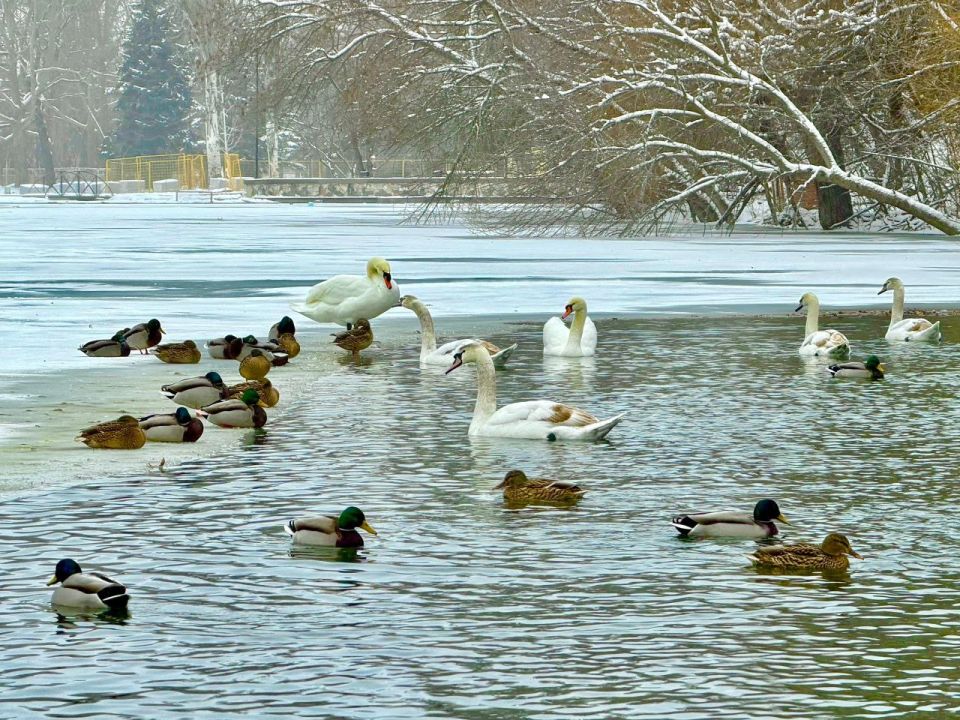 Пруд в парке Гагарина частично покрыт льдом. Однако условия остаются комфортными для водоплавающих птиц: водоем не замерзает полностью, позволяя птицам добывать естественный корм. Пернатые хорошо приспособлены к морозам до –15 °C. В холода лебеди выбирают безопасное место на льду, ложатся и отдыхают. Это не значит, что птица примёрзла и её нужно спасать. Таким способом в мороз лебеди берегут энергию и поддерживают тепло.
