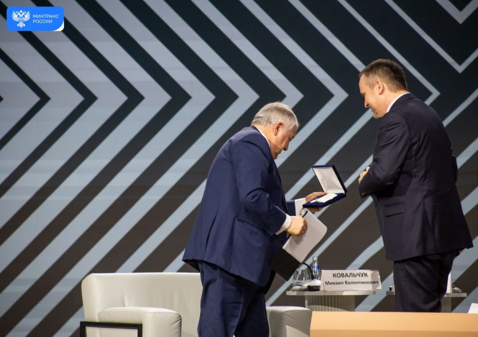 За выдающиеся личные заслуги в области транспортной науки министр транспорта вручил модератору сессии, президенту Курчатовского института Михаилу Ковальчуку ведомственную Медаль Августина Бетанкура.