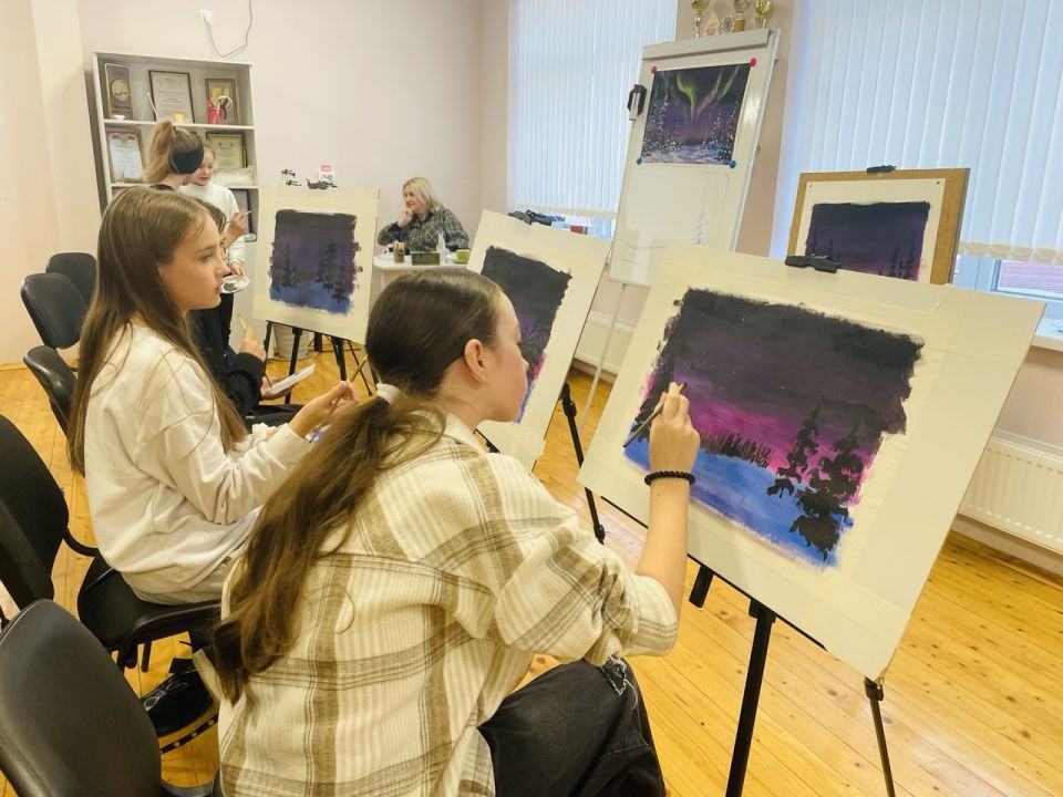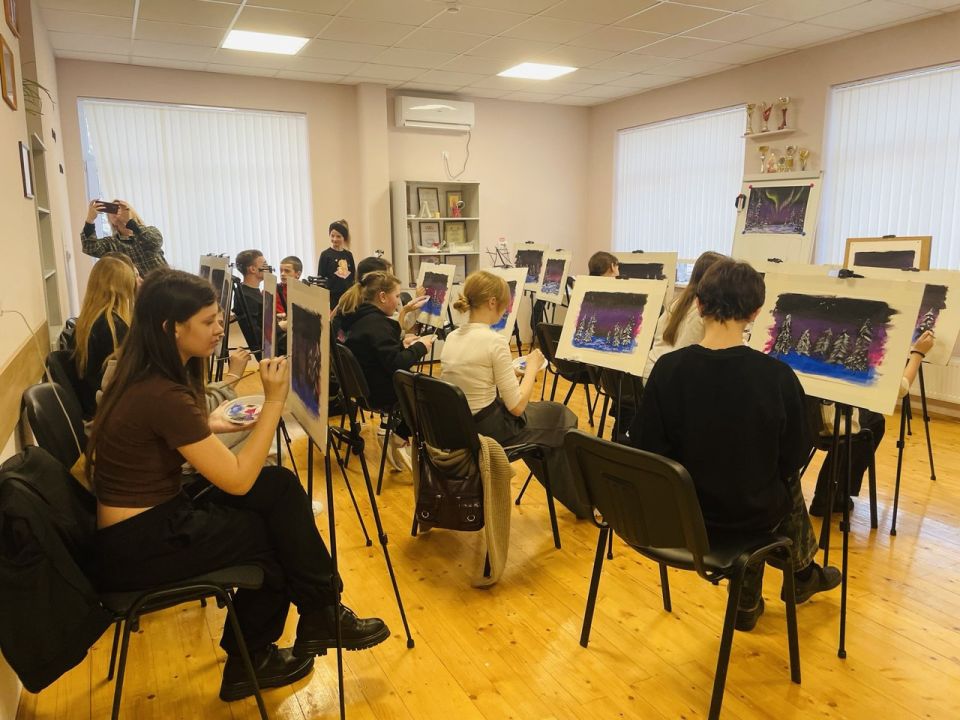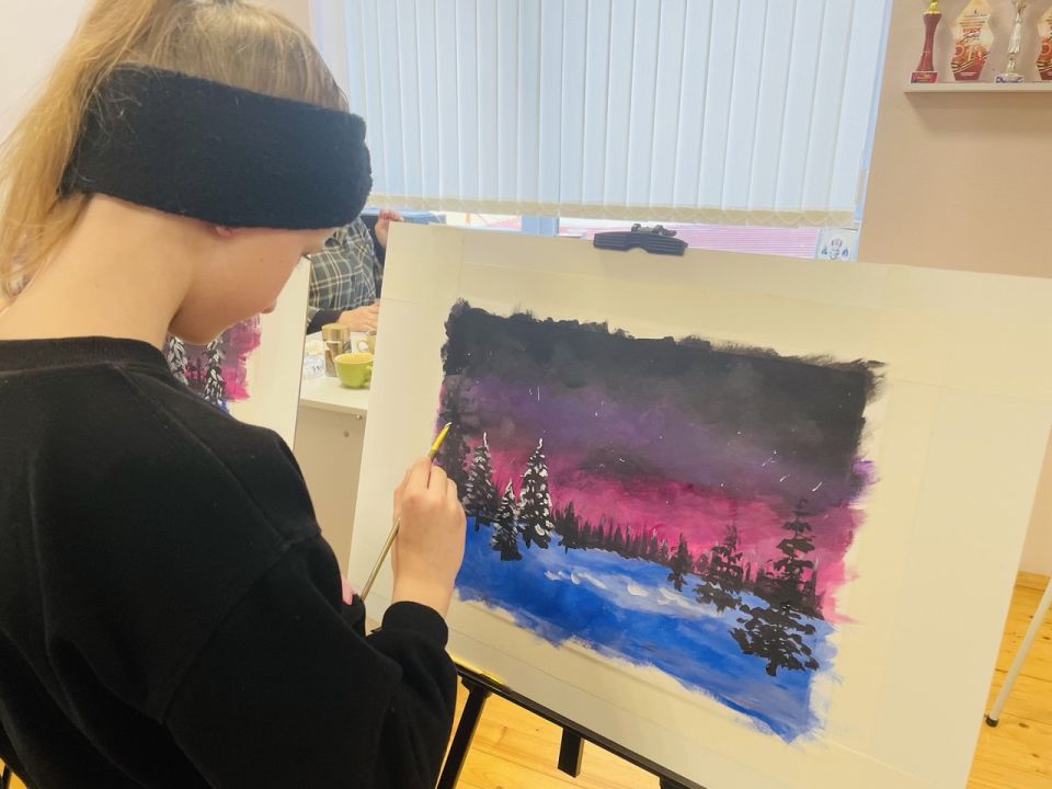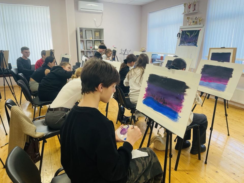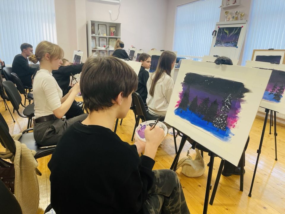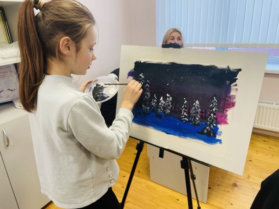 Участниками мастер-класса стали клубных формирований Майского дома культуры. Они написали картину под названием «Зимний лес». Дети ознакомились с теорией линейно-воздушной перспективы и построения композиции. Освоили методику создания цветового градиента и способом реалистичного изображения предметов.