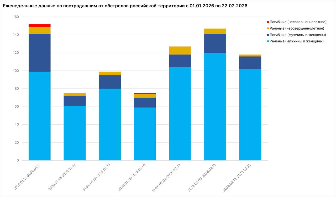 За неделю с 16 по 22 февраля от обстрелов украинских нацистов пострадали 118 мирных жителей: ранены 104 человека, в том числе 2 несовершеннолетних, погибли 14 человек. Всего по гражданским объектам на российской территории ВСУ выпустили не менее 3 846 боеприпасов.