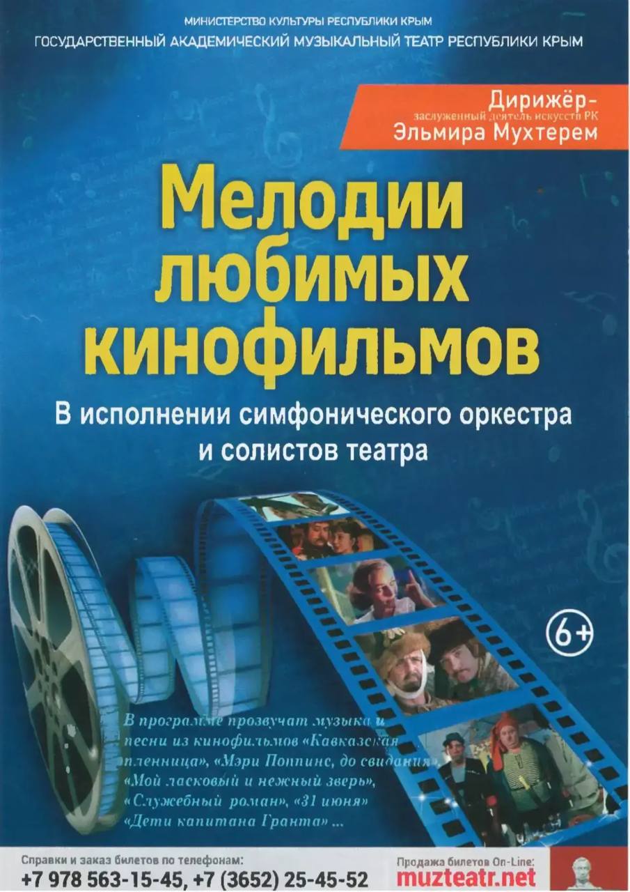 Знакомые с детства мелодии из «Кавказской пленницы», «Служебного романа», «Мэри Поппинс» и других культовых фильмов прозвучат в исполнении симфонического оркестра и солистов театра. Дирижёр – Заслуженный деятель искусств РК Эльмира Мухтерем.