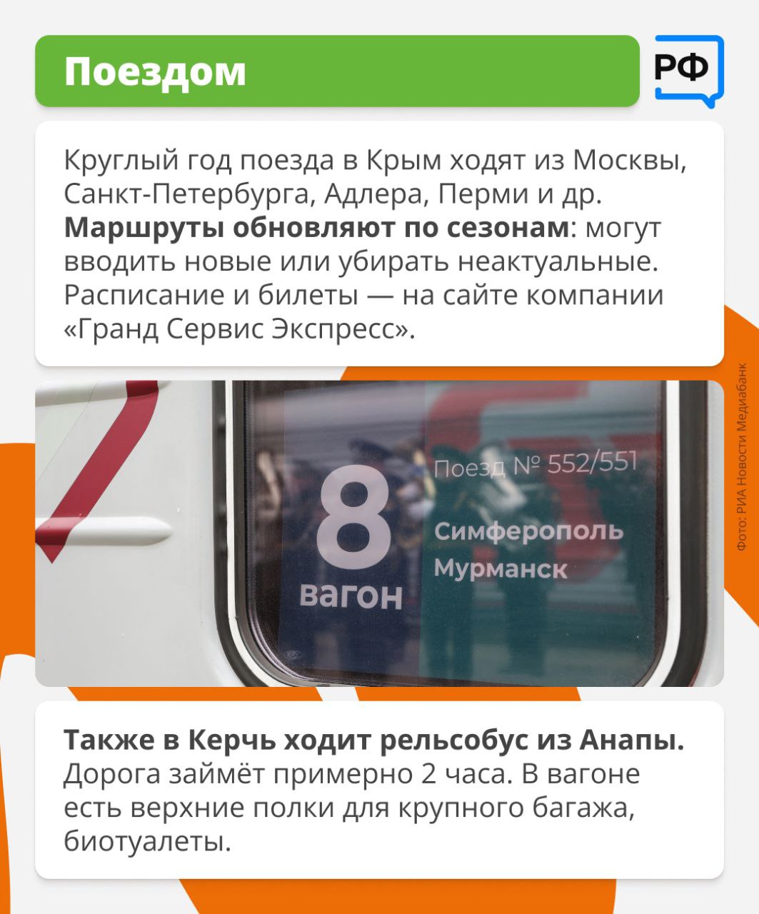 Чаще всего на полуостров ездят на машине — через Керченский пролив или по сухопутному маршруту через новые регионы. Также туда ходят поезда. Подробнее обо всех вариантах — в карточках.