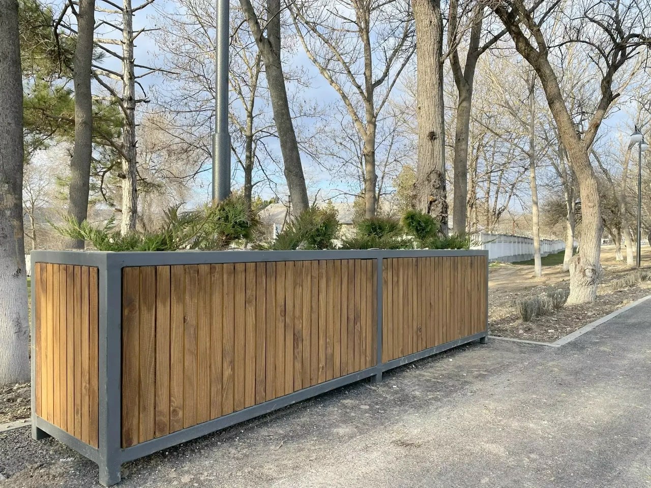 Аллею также украсили 9 стильных вазонов с туями и можжевельником –теперь они добавляют зелени и создают особую атмосферу.