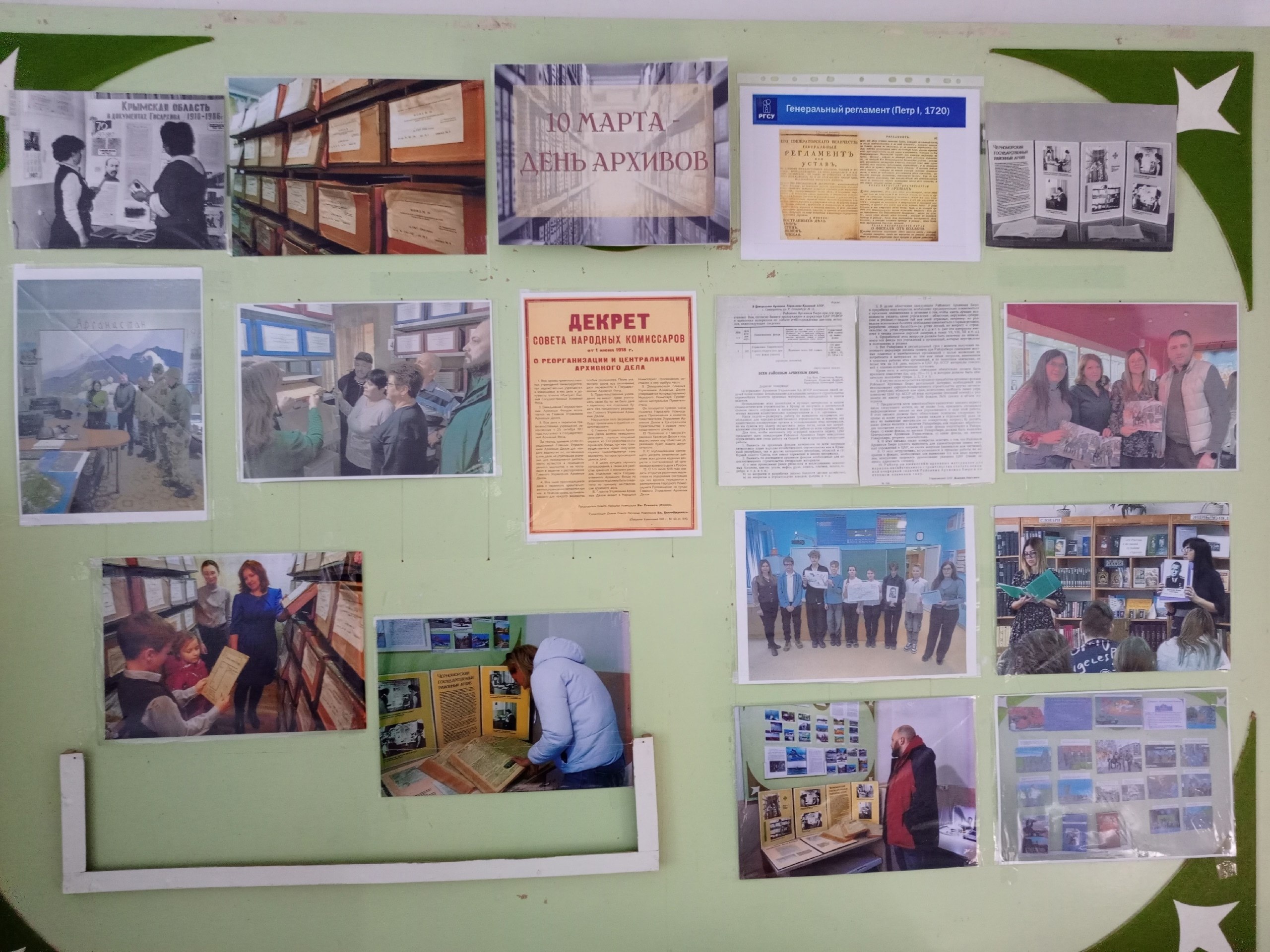 Выставочный стенд оформлен фотографиями мероприятий, которые проводил архивный сектор в разные годы - это выставки, дни открытых дверей, школьные уроки, экскурсии по архивохранилищам.