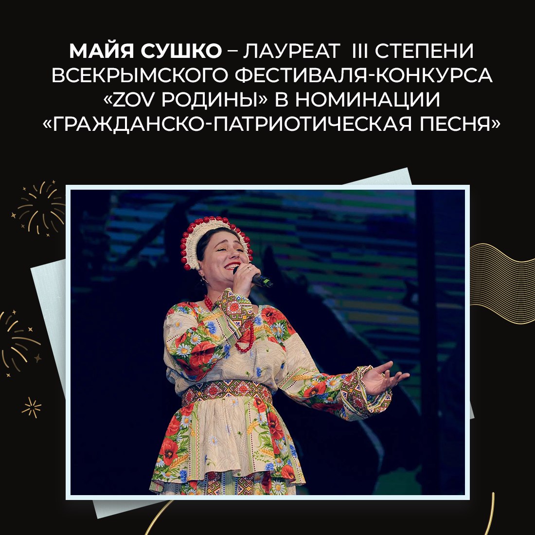 Майя Сушко, солистка и руководитель вокального коллектива «Огни» Джанкойского городского центра культуры и досуга, стала лауреатом III степени в номинации «Гражданско-патриотическая песня». Она исполнила композицию «Братья славяне».