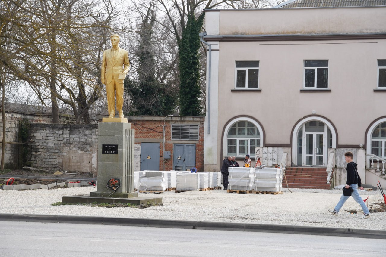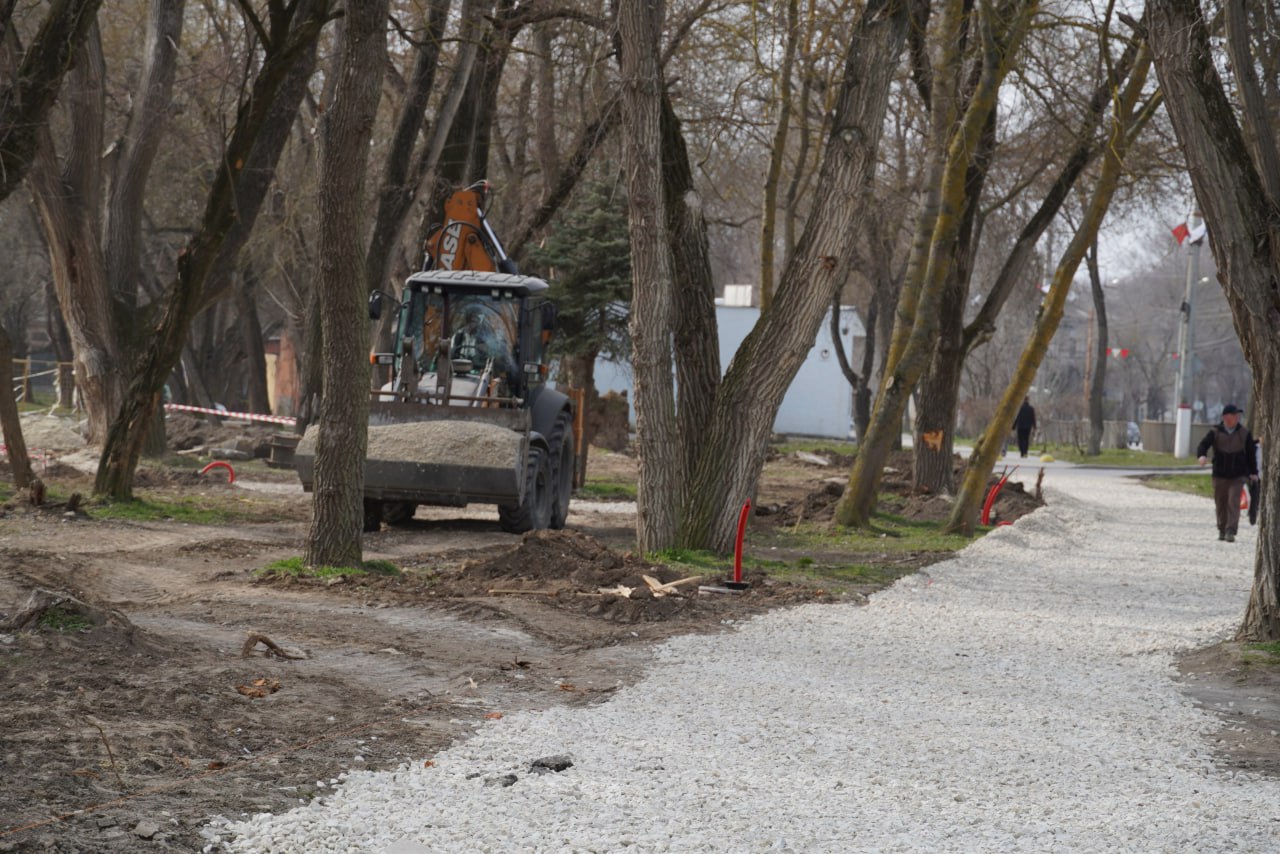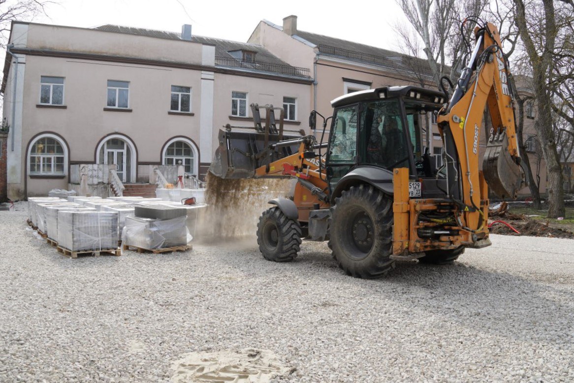 Сейчас работы сосредоточены у памятника П.Л. Войкову. Уже установлены закладные детали, проложены кабели освещения. Ведется подготовка основания — отсыпка щебнем под будущую укладку плитки. Служба городского хозяйства выполняет обрезку кустарников и сухостоя.